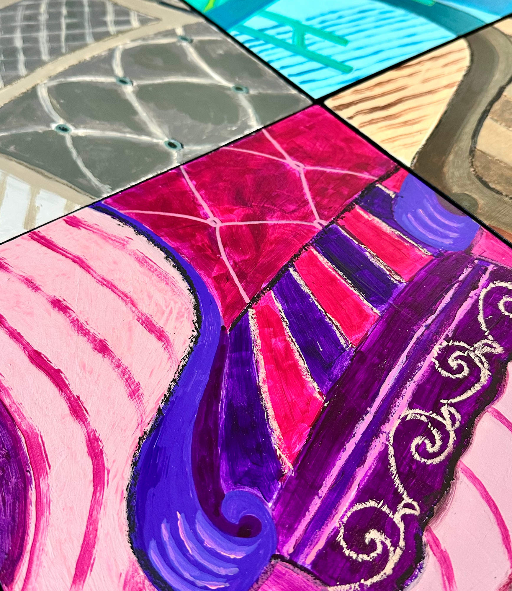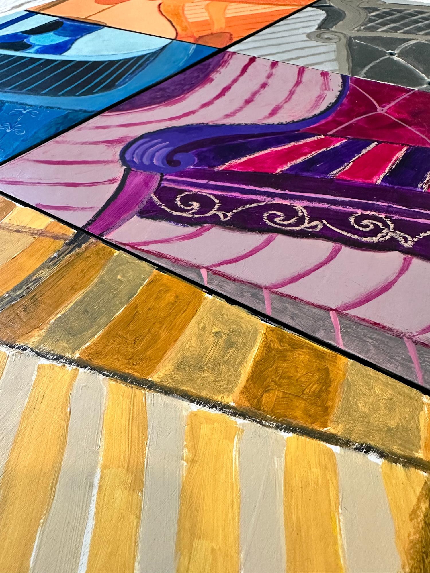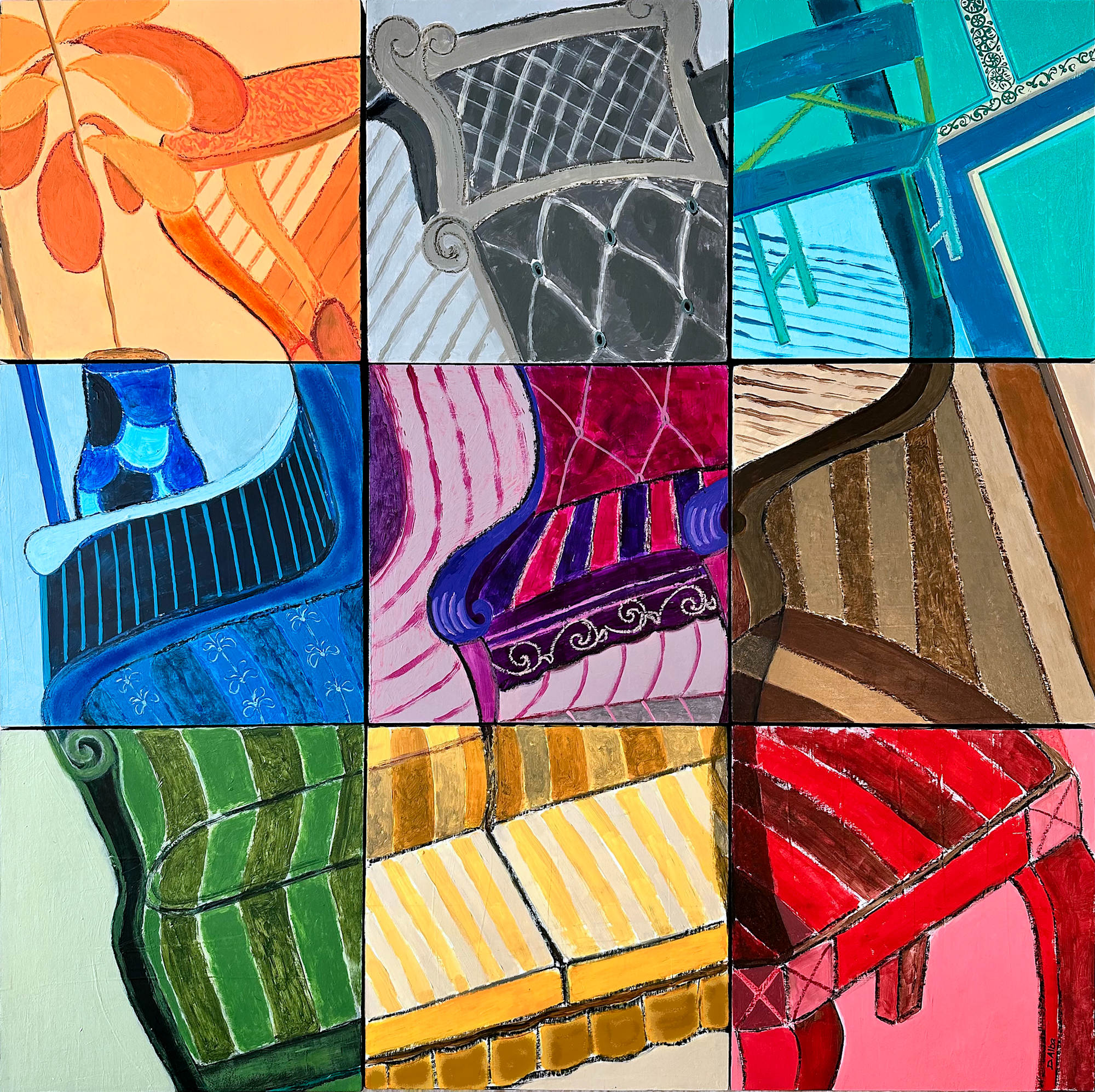 "10 Chairs" is a nonaptych (nine-panel artwork) that challenges our perception of form and content. This complex piece is a sophisticated play on perspective and the relationship between individual parts and the whole. Each panel offers a unique and distinct rendering of a single chair, executed in a variety of styles, from impressionistic strokes to bold, flat color fields. The vibrant and varied color palette creates a dynamic rhythm, while intricate patterns within each panel invite close examination.