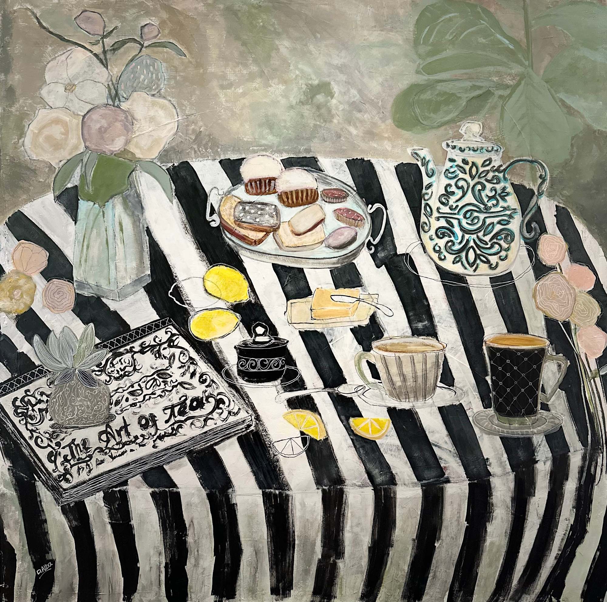 "Afternoon Tea #2" offers a delightful and visually stimulating tableau of a refined tea setting. The artist presents a tabletop draped with bold black and white stripes, upon which a curated collection of tea-related objects is artfully arranged. A decorative teapot and two elegant teacups with contrasting patterns anchor the scene, accompanied by a silver platter laden with delicate pastries, a sugar bowl, and slices of bright yellow lemon. A vase holding stylized flowers and a book titled "The Art of Tea" further enhance the atmosphere of leisurely indulgence.