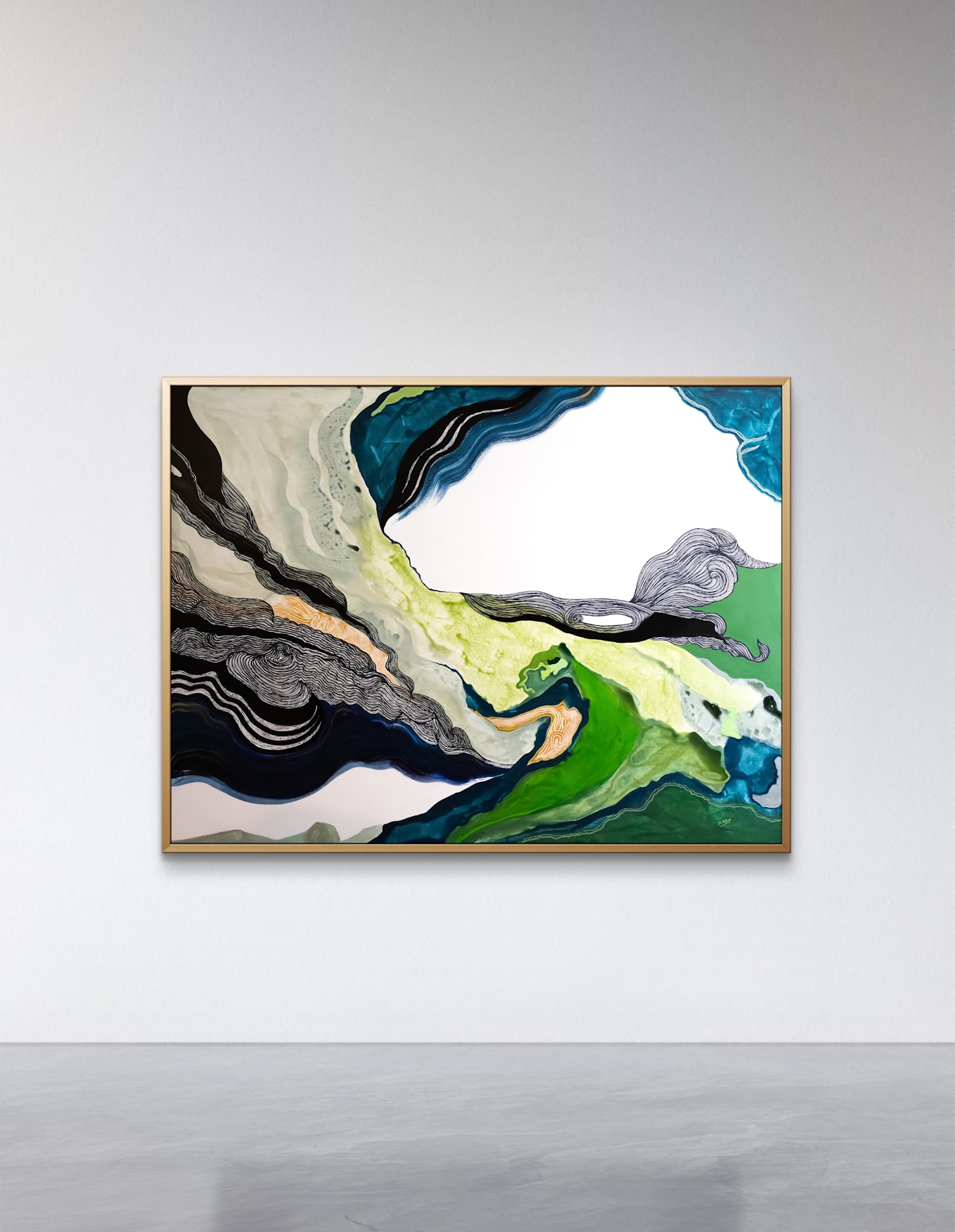 Critically, the piece triumphs in its balance of precision and spontaneity, merging meticulous illustrative mark-making with the freedom of abstract expressionism. The movement is sophisticated, utilizing heavy, dark currents to support lighter, luminous tones that soar across the canvas. Ultimately, "All, Connected" serves as a poignant visual metaphor for the invisible threads of the natural world, offering a technically proficient and deeply meditative experience.