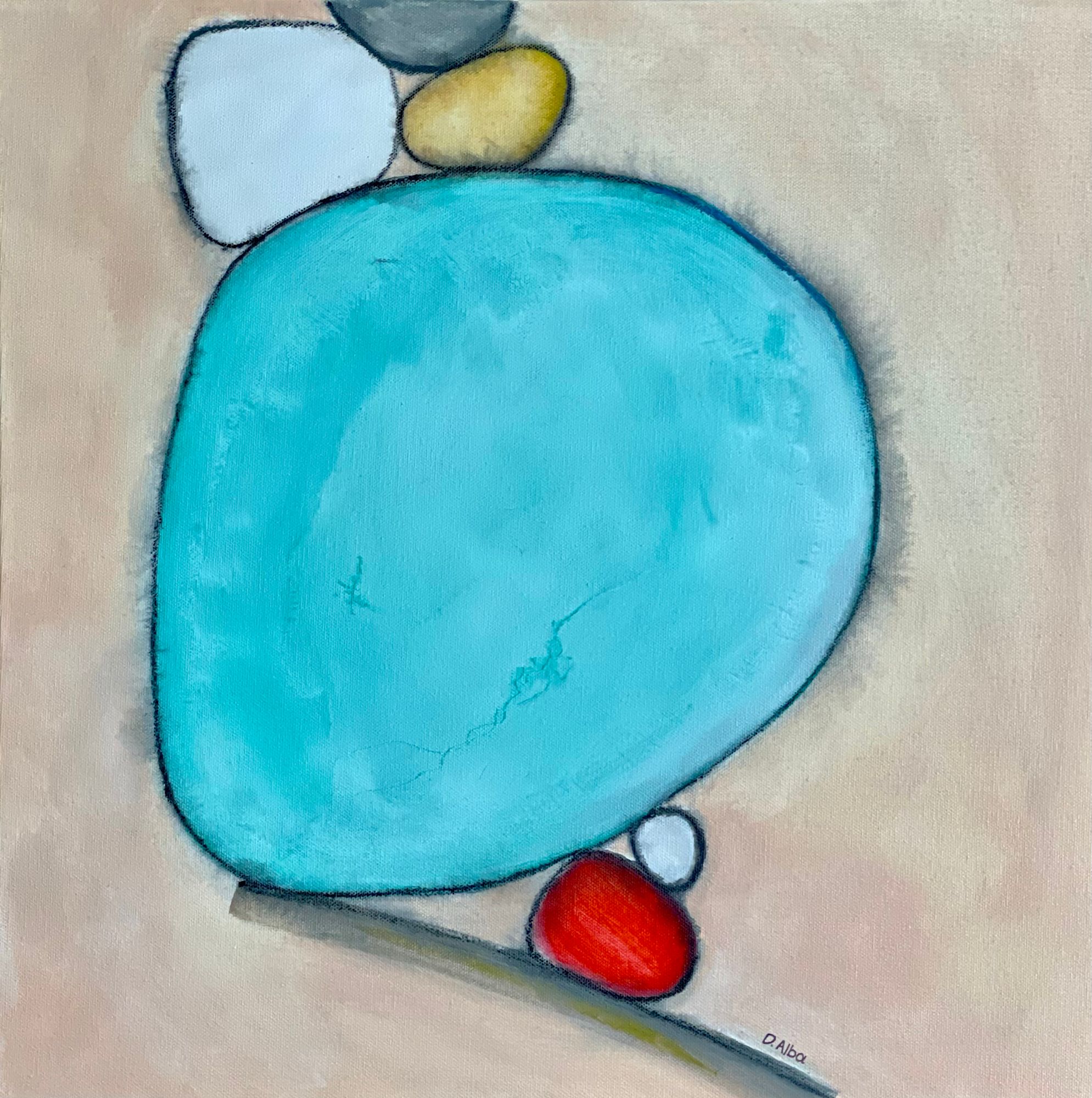 "Balancing Act #3" is a captivating study of equilibrium and precarious harmony. The artist presents a carefully arranged tableau of simplified, organic forms, each rendered in a distinct yet complementary color palette. A substantial, azure-toned shape serves as a focal point, seemingly supporting a delicate stack of variously sized and colored elements – a soft white, a muted grey, and a warm yellow rest above, while a vibrant crimson and a small white counterpoint find their precarious balance below, all seemingly anchored by a subtly rendered, elongated form that hints at a supporting base.