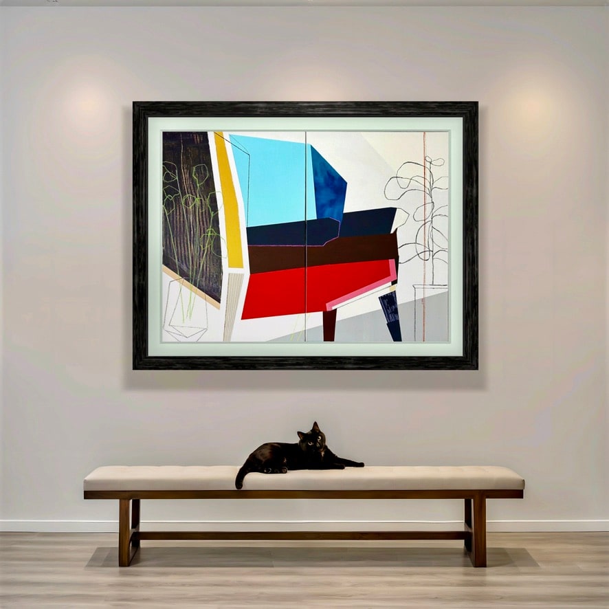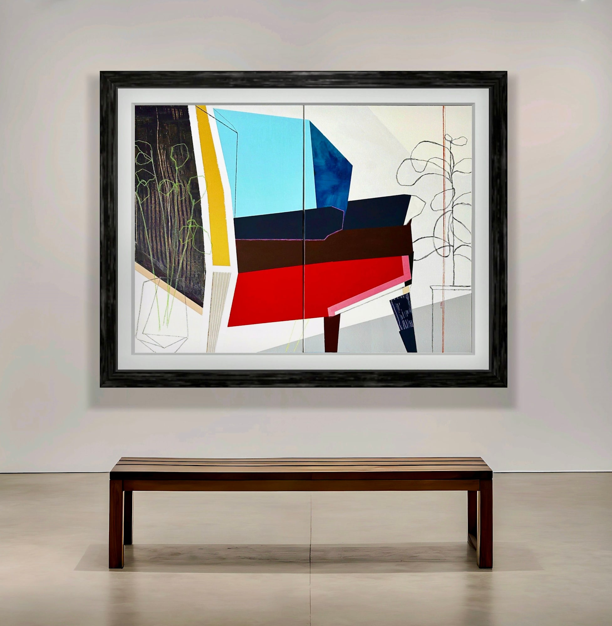 "Chair I" is a compelling diptych that captures a moment of domestic familiarity through the lens of bold abstraction and sharp formalism. With its striking geometric composition, the artist deconstructs the humble armchair into a symphony of color blocks, angular forms, and layered textures. Planes of cerulean blue, crimson red, and ochre yellow converge and contrast with graphic precision, while subtle painterly gestures soften the rigidity of the architectural lines. The composition, split across two canvases, engages in a dynamic conversation between balance and fragmentation in a visual dialogue that draws the viewer into a space that feels both constructed and intimate.