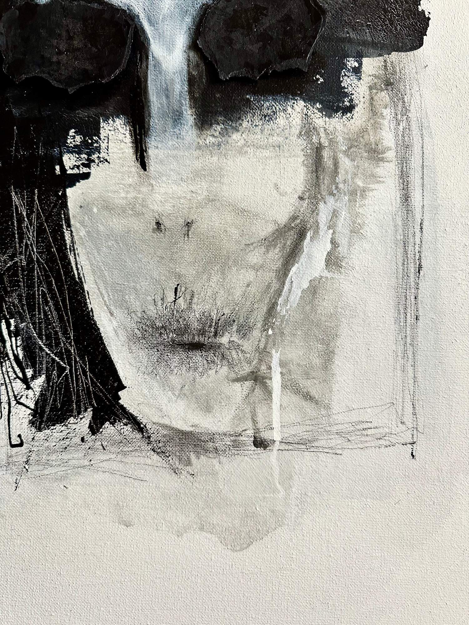 "Consumed" is a striking mixed-media work that delves into the shadowy depths of the human psyche, masterfully employing a monochromatic palette to evoke a sense of disquiet and introspection. The central figure, emerging from a dense, almost obliterating black, presents a visage simultaneously obscured and revealed. The stark white form, reminiscent of a skull or a ghostly presence, suggests a stripping away of identity, while the dark, hollowed eyes sockets consume the viewer's gaze, hinting at an internal void or an overwhelming burden. The raw, gestural brushstrokes and fragmented lines contribute to a feeling of deconstruction and emotional vulnerability, as if an unseen force is slowly consuming the subject, or perhaps by their internal struggles.