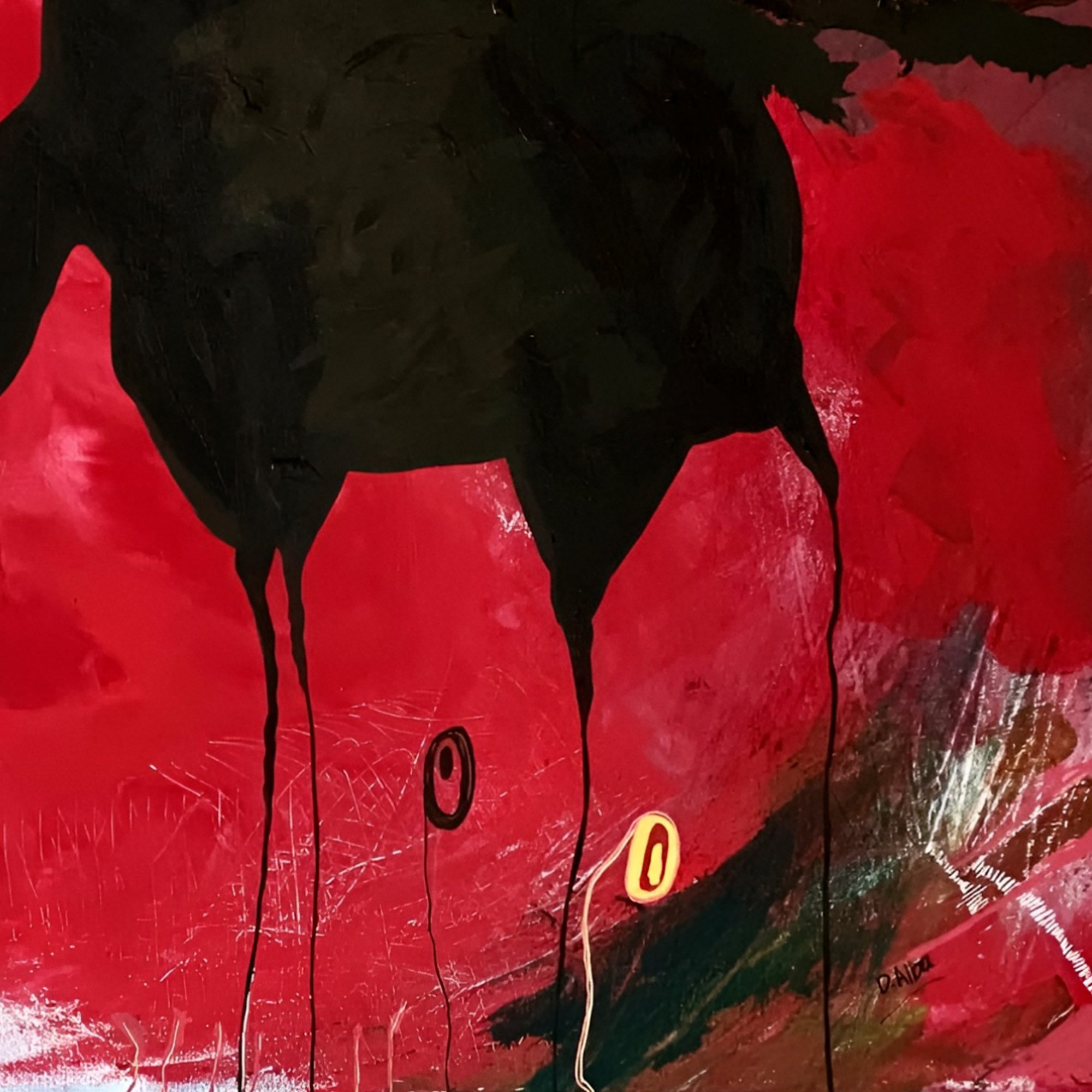 The precariousness of existence, a central theme, is brilliantly articulated through the elongated, impossibly thin legs supporting the dark, monolithic figure. These delicate stilts, barely tethering the form to the turbulent ground, serve as a stark metaphor for humanity's fragile footing on a planet scarred by its actions. This visual instability powerfully conveys the artist's commentary on the devastating environmental and societal consequences of human behavior. The isolated, watchful "eyes" scattered across the canvas, reminiscent of ancient symbols or tribal markings, further amplify a sense of unease and perhaps a distant, indifferent gaze upon our self-inflicted predicament. "Full Of Regret" is not merely a painting; it is a profound meditation on the human condition, rendered with an urgent and captivating artistic voice.