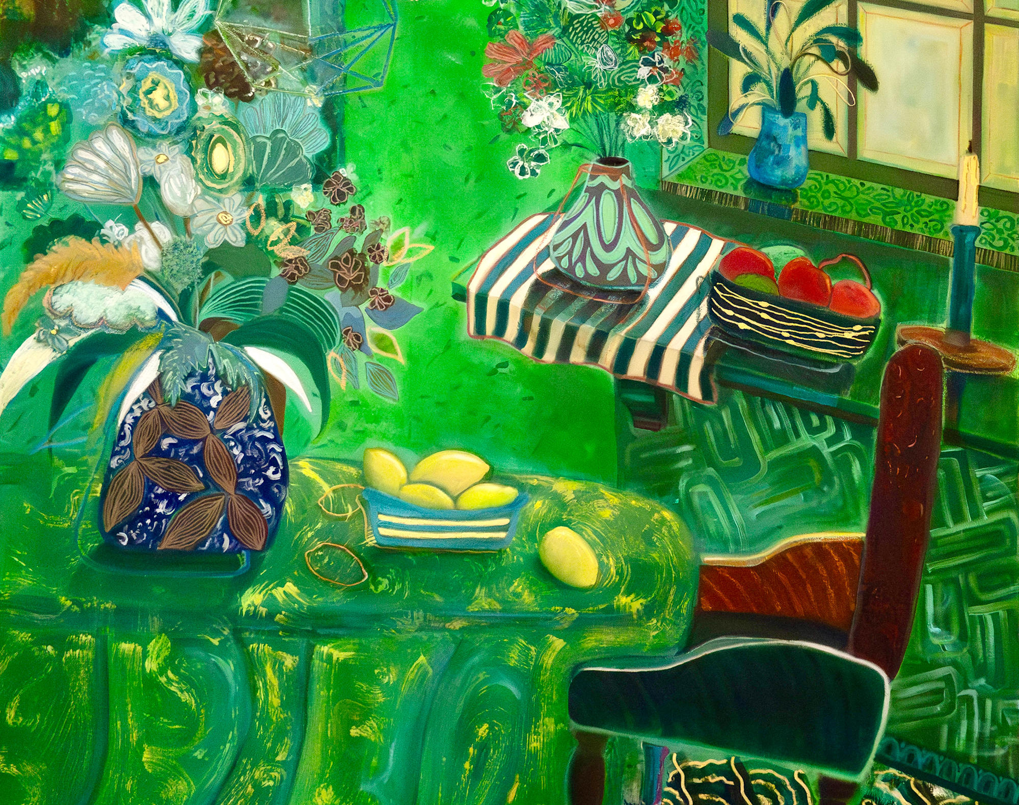 The painting delves into a realm of heightened sensory experience. The lushness of the green is almost palpable, evoking feelings of tranquility and perhaps a touch of the uncanny, and the interplay of patterns and textures adds a layer of visual complexity and movement. "Green Room" is an invitation to step into a world where color reigns supreme, and the ordinary is imbued with an extraordinary, almost whimsical charm.