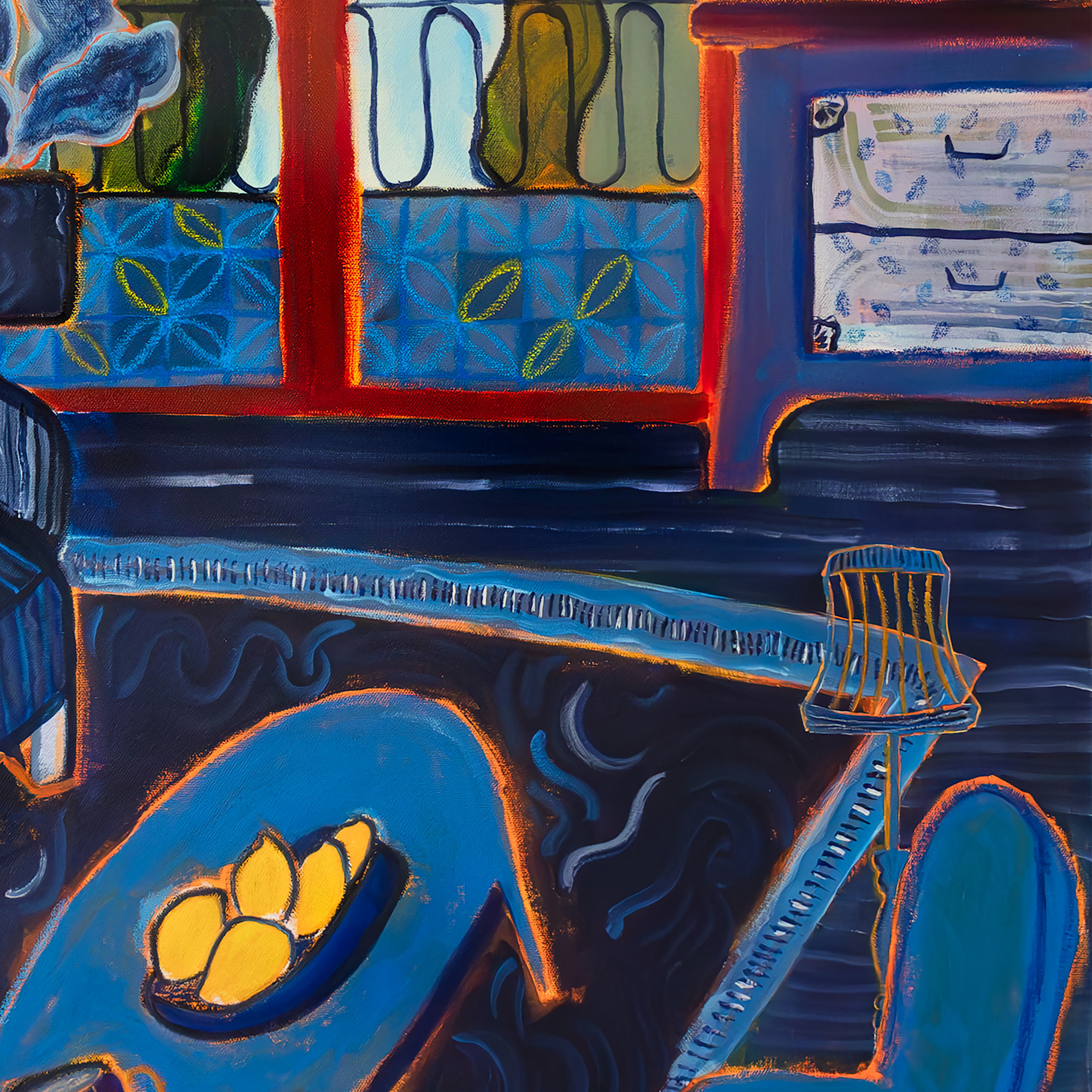 In "Indigo Room," the artist skillfully blends Fauvist influence with contemporary domesticity, transforming a private interior into a vibrant, dreamlike sanctuary. The dominance of deep indigo and cobalt creates a rhythmic, nocturnal atmosphere, punctuated by the high-contrast warmth of reds and luminous yellow citrus. With its flattened perspective and bold, gestural outlines, the composition evokes the expressive spirit of Matisse, inviting the viewer into a space that feels both intimate and expansive.