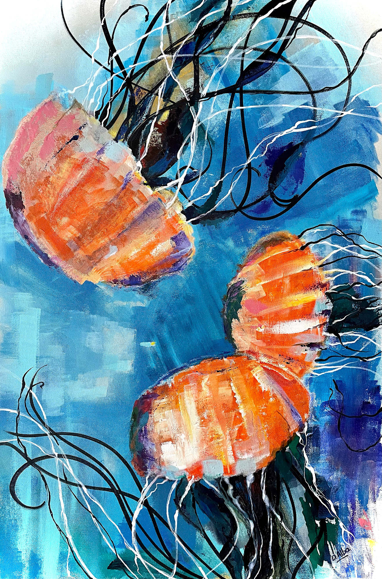 "Lion's Mane" plunges the viewer into an ethereal aquatic realm, dominated by the graceful and somewhat otherworldly presence of jellyfish. The artist employs a vibrant and fluid application of paint, with swathes of cerulean and turquoise creating a dynamic sense of underwater currents. Against this watery backdrop, two prominent jellyfish forms emerge, their bell-like bodies rendered in warm hues of orange and hints of purple, suggesting a luminous translucence. Trailing behind them, a tangle of expressive black and white lines evokes the delicate and often stinging tentacles, adding a sense of movement and organic complexity.