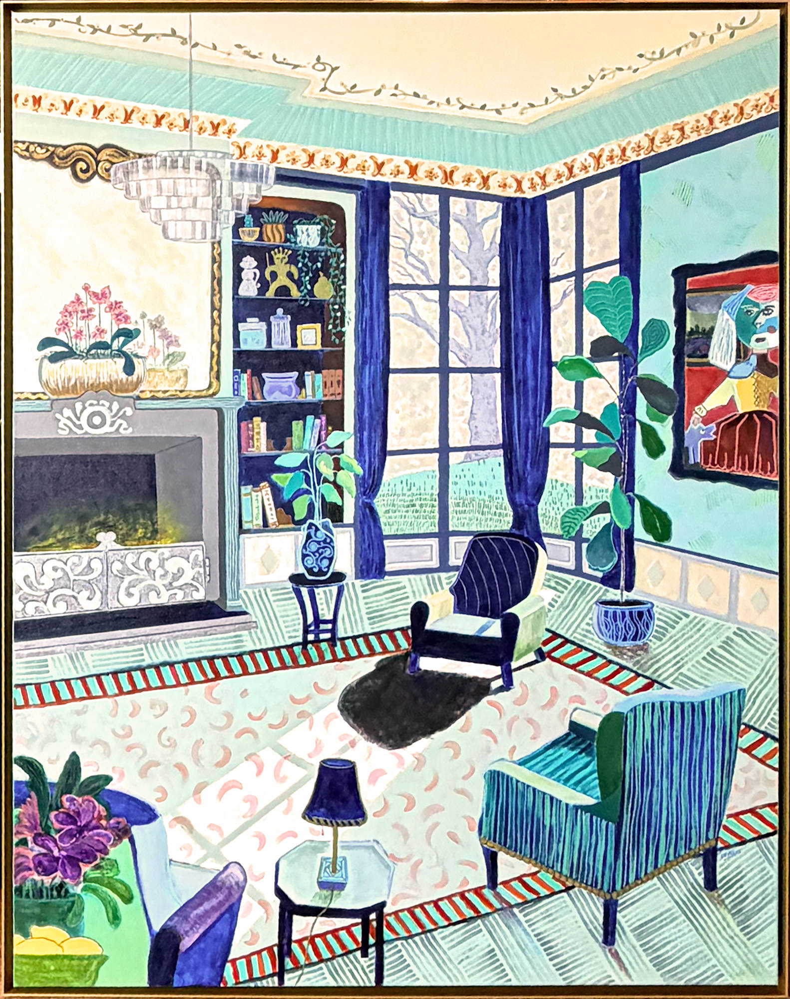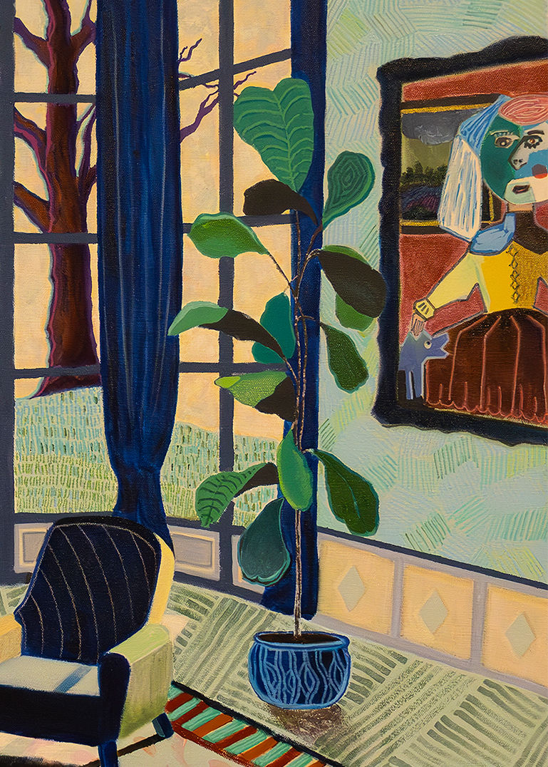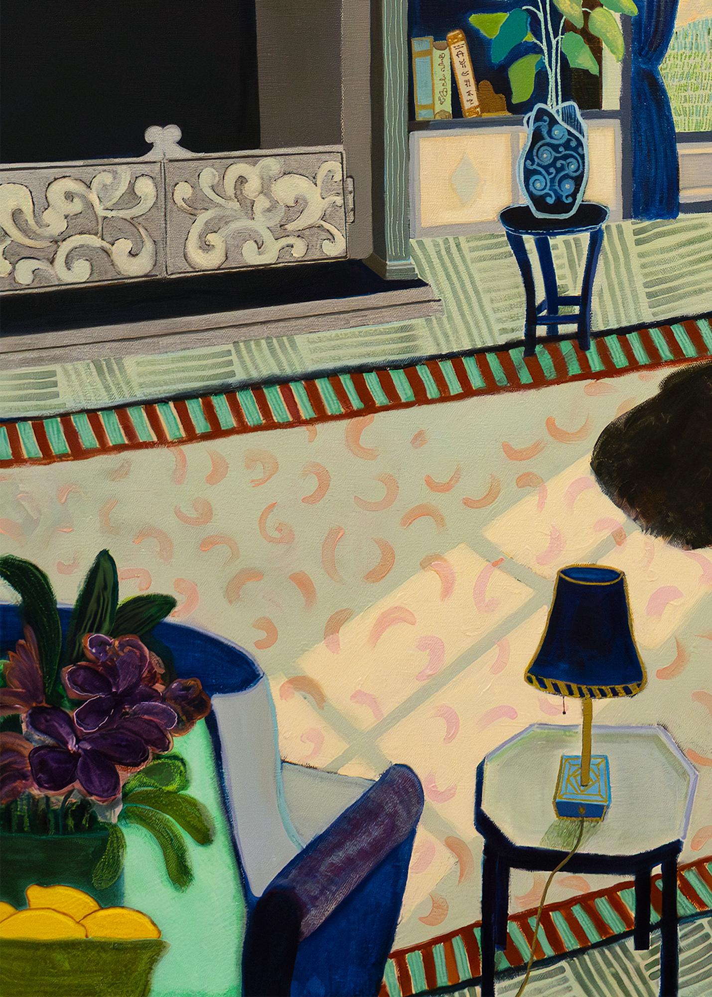 The painting's depth lies in its juxtaposition of interior intimacy and external drama. The carefully curated interior objects suggest a life both intellectually rich and deliberately organized. Yet, the stark, barren tree framed in the window and the dramatic shadows cast across the rug introduce an unsettling, melancholic counterpoint. This painting exudes a sophisticated air of contemporary decorative abstraction, juxtaposing the comforts of an embellished interior with the existential weight of the outside world.