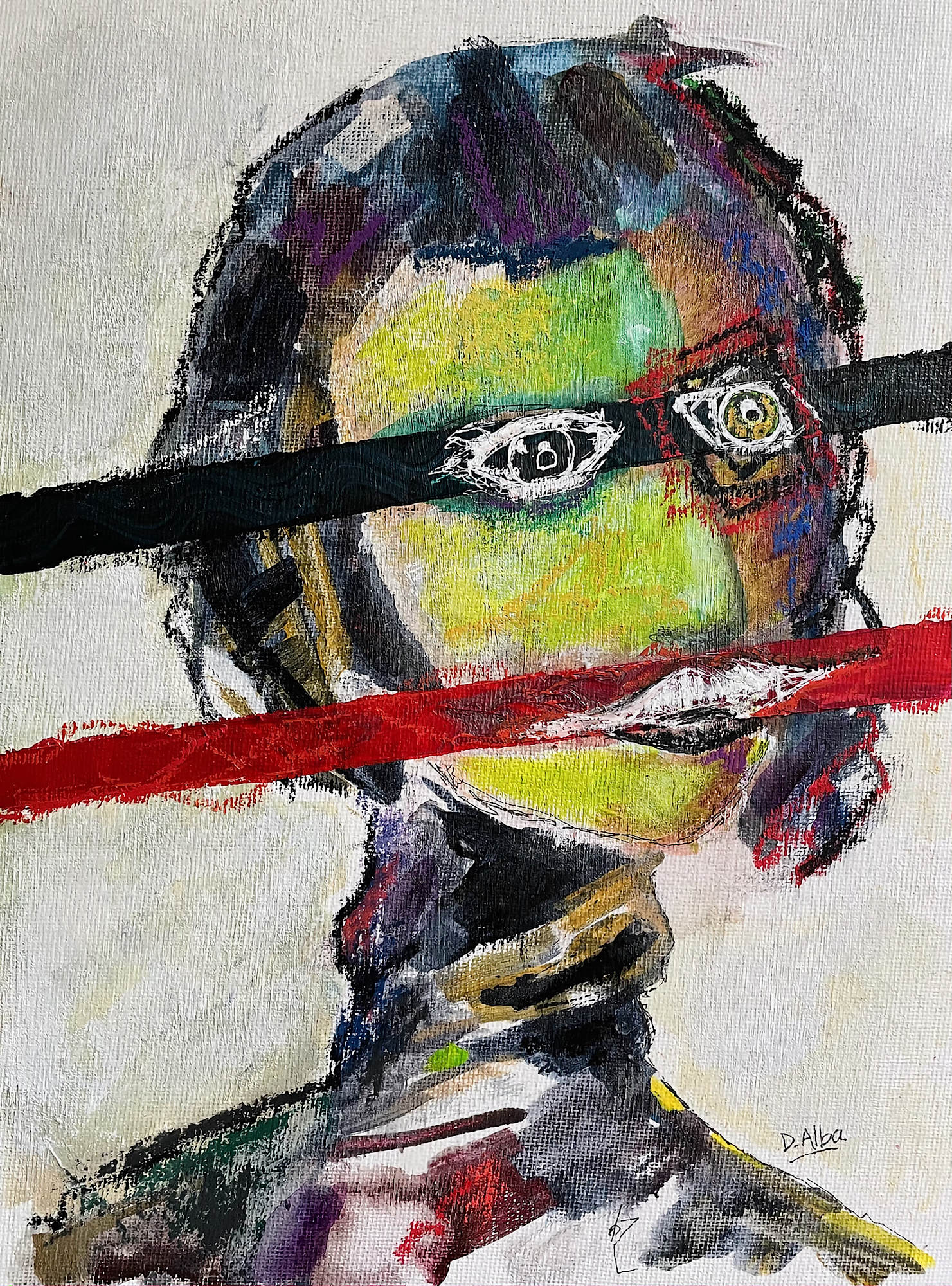 "Rough Night" is a compelling and emotionally raw portrait rendered with a palpable sense of unease and fragmentation. The artist employs a textured and somewhat distressed application of paint, with layers of muted greens, grays, and blacks coalescing to form a human-like head and shoulders. The facial features are distorted and unsettling, with wide, anxious eyes that seem to peer out from beneath a heavy brow. Bold horizontal bands of black and red slash across the face, obscuring and disrupting the features, adding to the overall feeling of disruption and discomfort.
