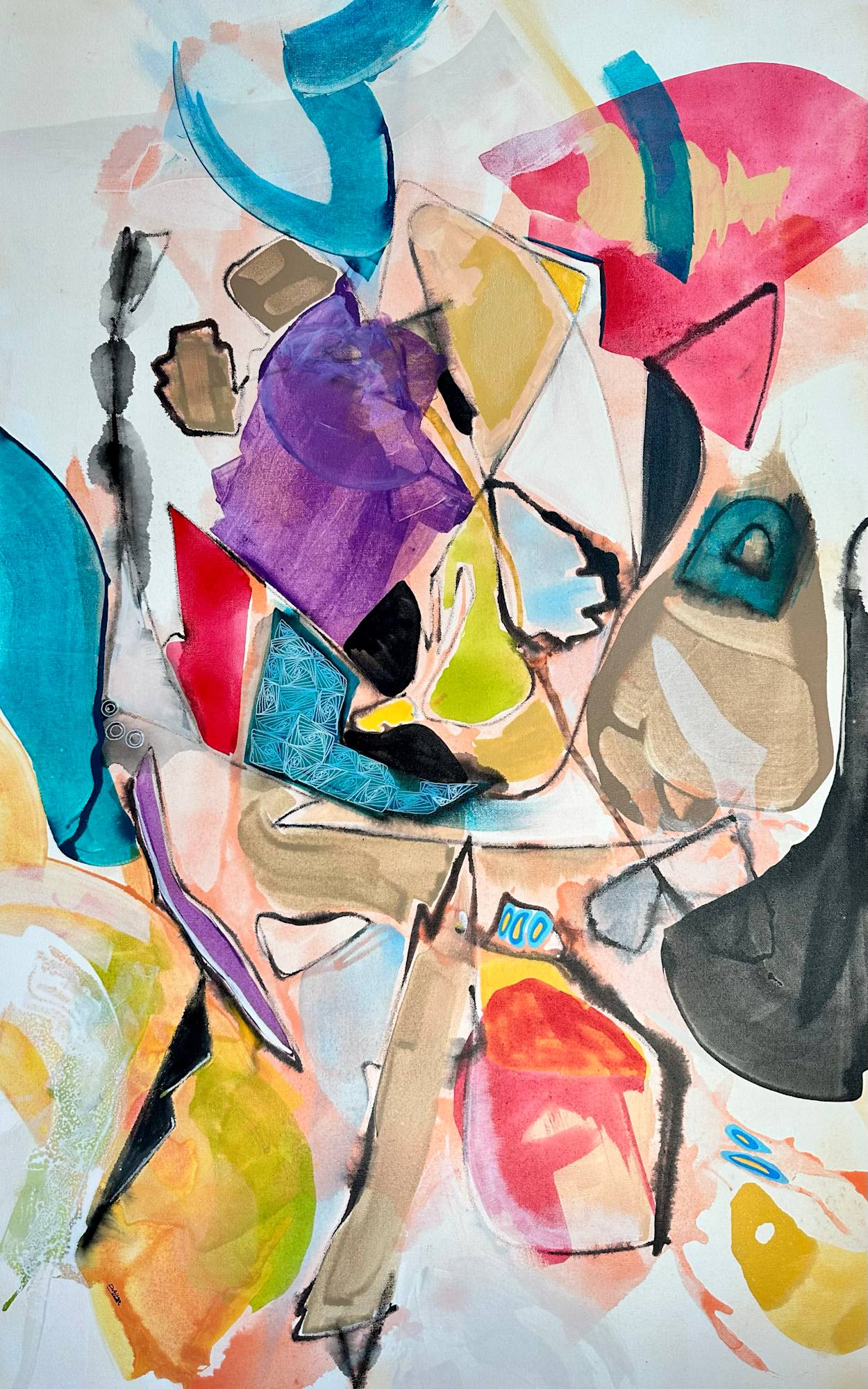 "Untitled #1" presents a dynamic and engaging exploration of abstract form and vibrant color. The canvas bursts with a playful energy, showcasing a collection of loosely defined shapes that overlap and interact in a seemingly spontaneous yet carefully considered composition. Hues of teal, purple, red, yellow, and brown dance across the surface, some rendered in bold, opaque strokes, while others appear as translucent washes, creating layers of depth and visual interest. The artist employs a variety of textures and mark-making techniques, from crisp edges to blurred gradients, inviting the viewer to explore the tactile qualities of the paint.