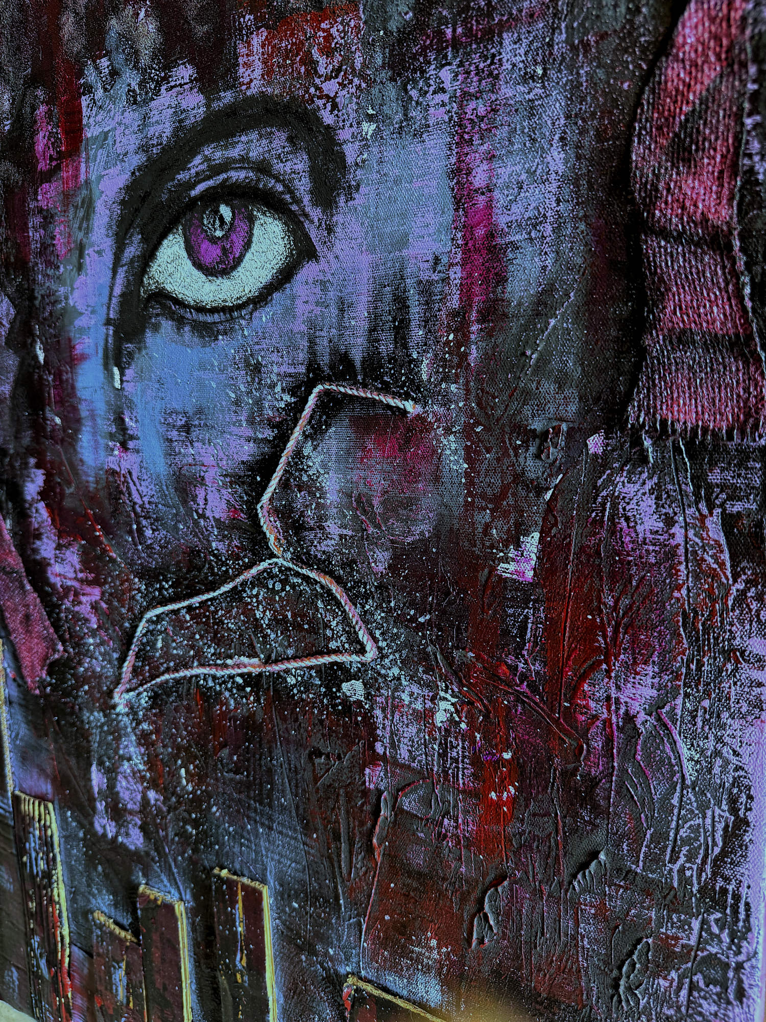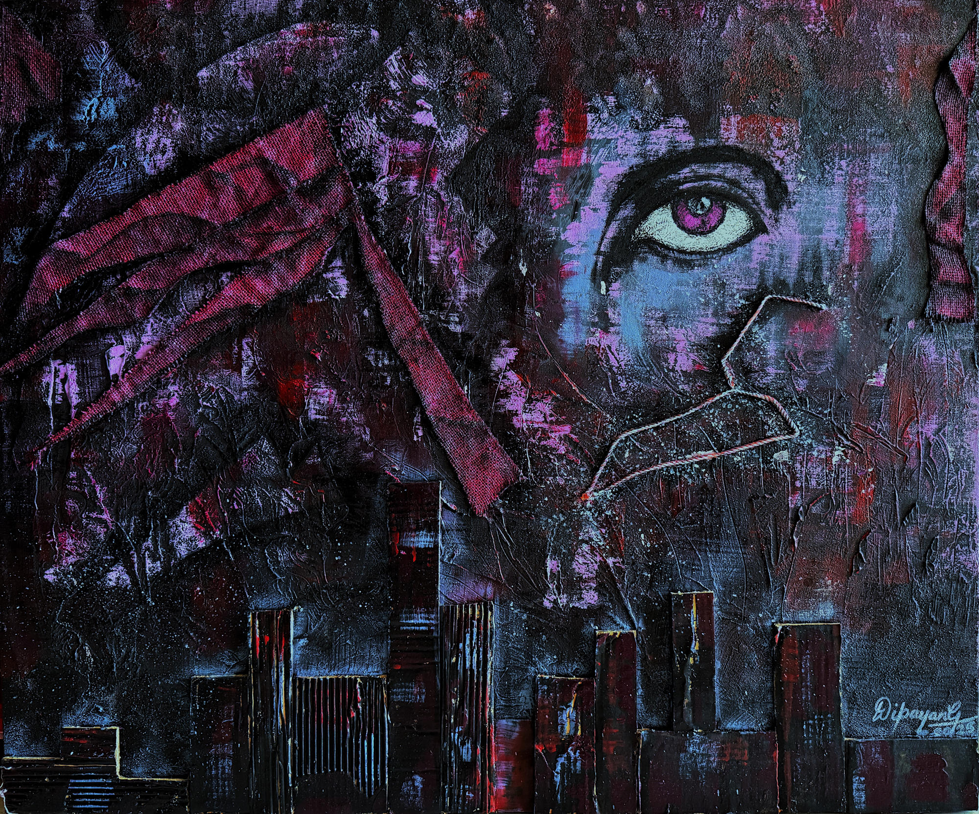The artwork uses purple shade to symbolise elegance and pride. The eye expresses arrogance and resides above the cityscape and also have the Leo constellation.