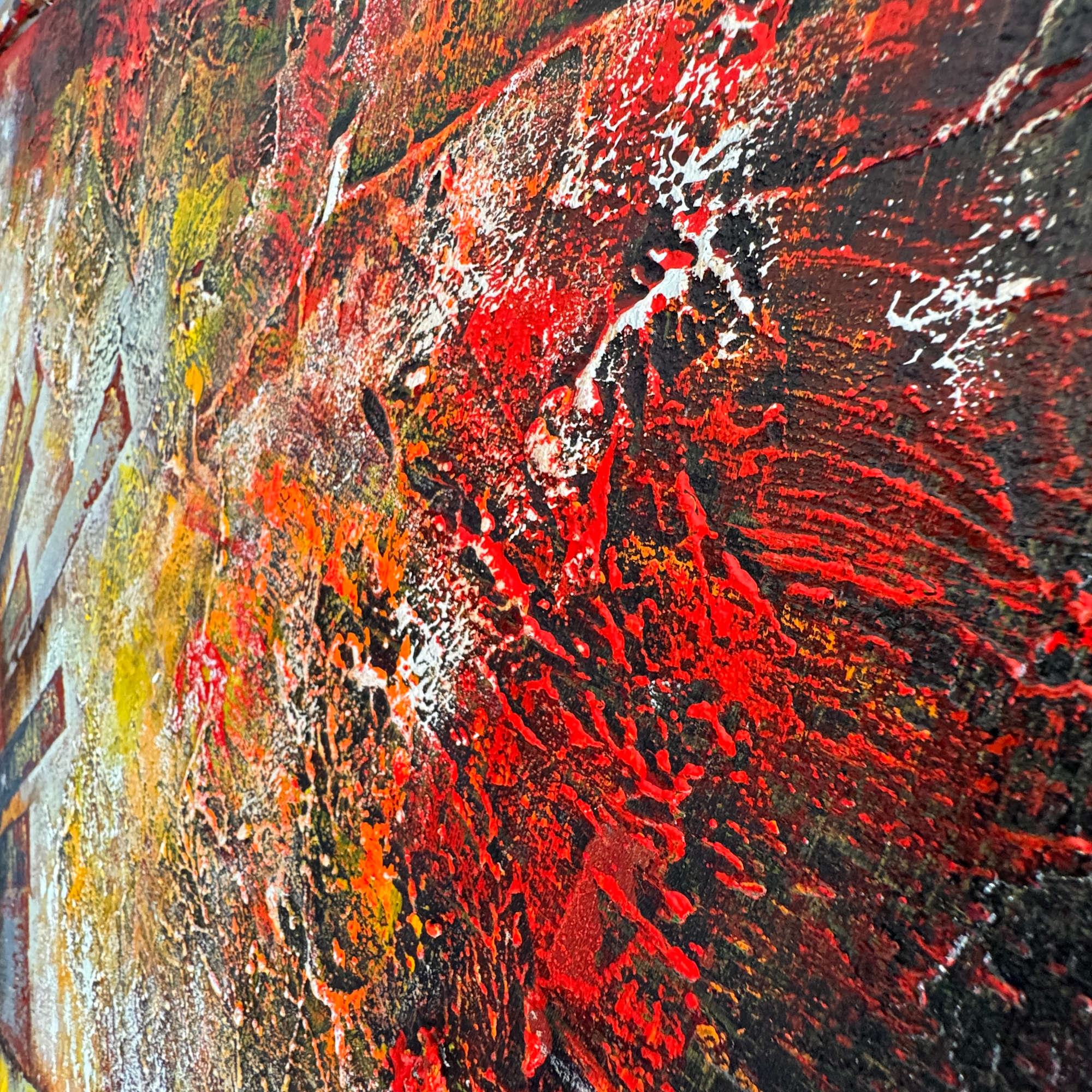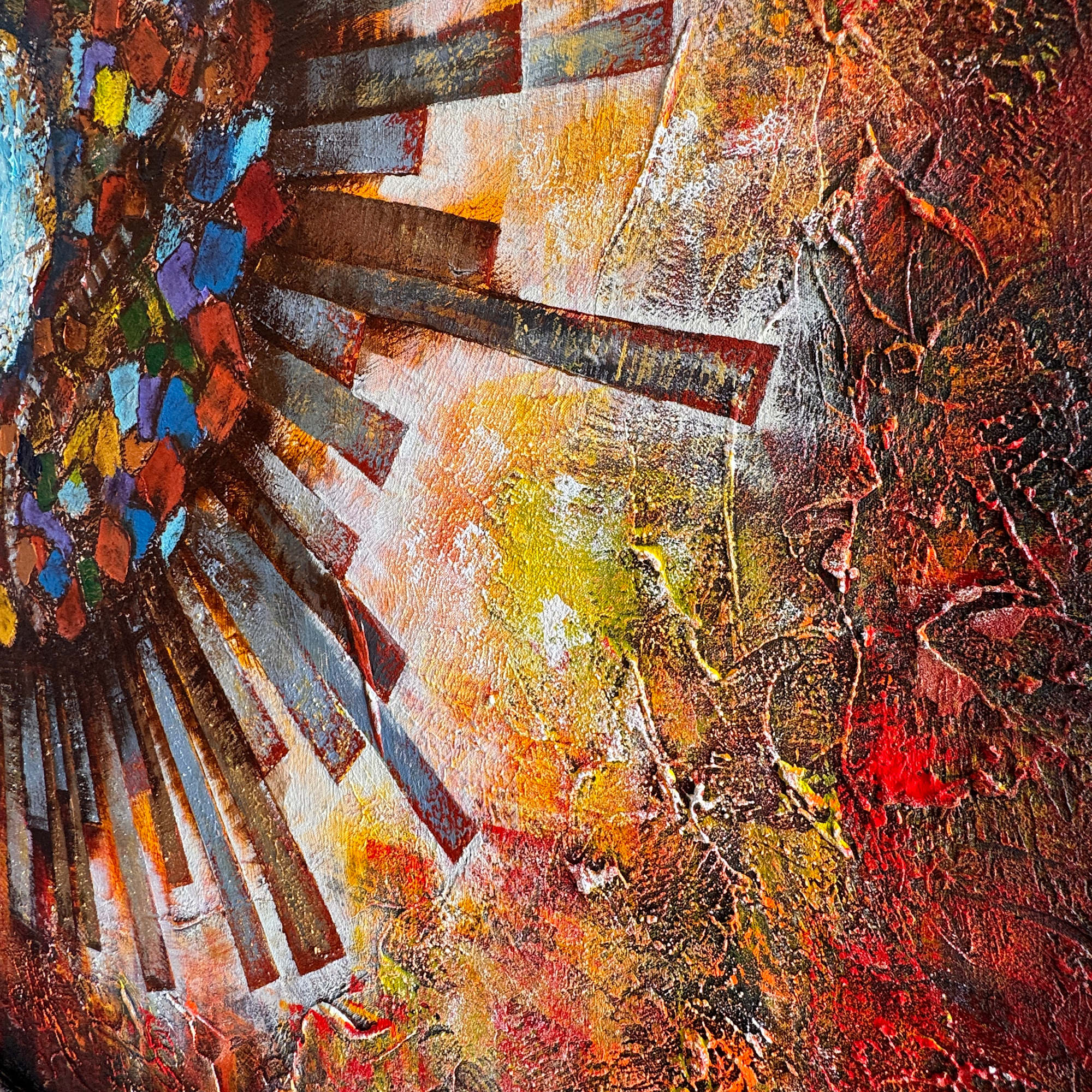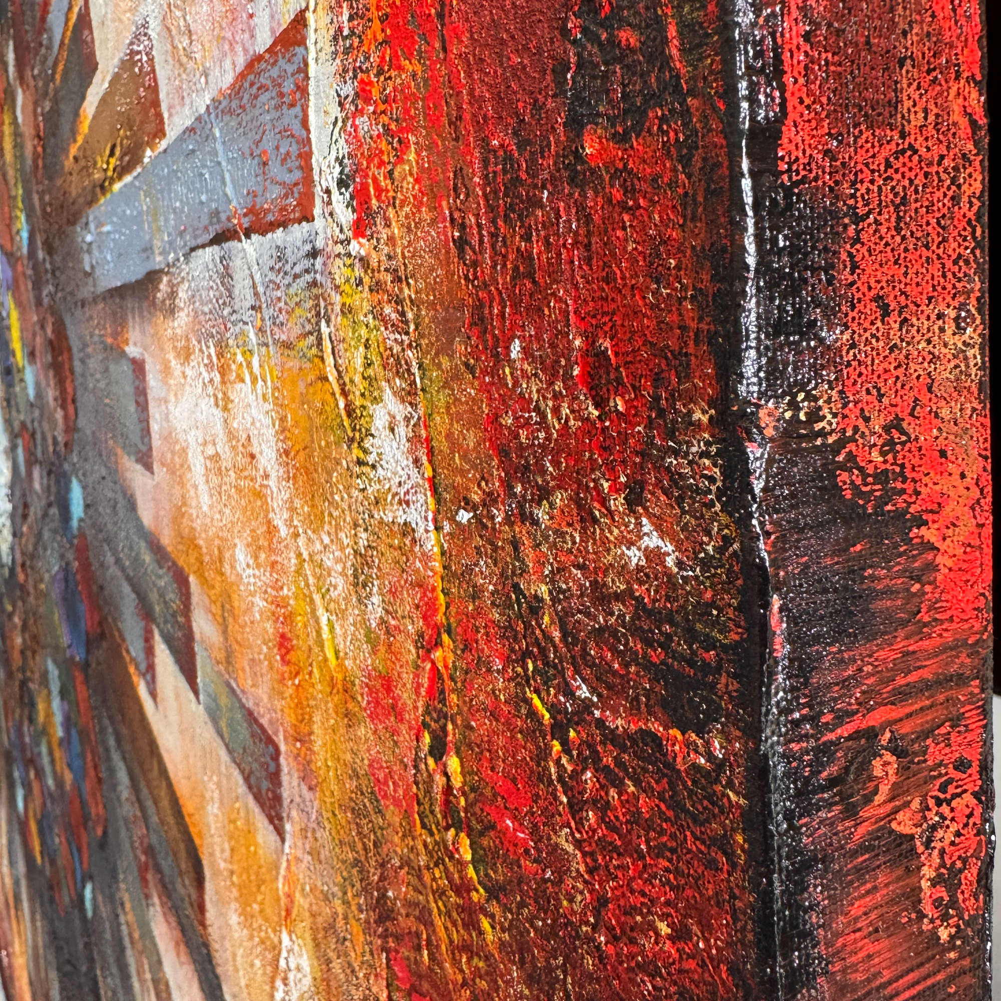 - Acrylic paints, Oil Sticks over sand and portland cement textures on stretched canvas