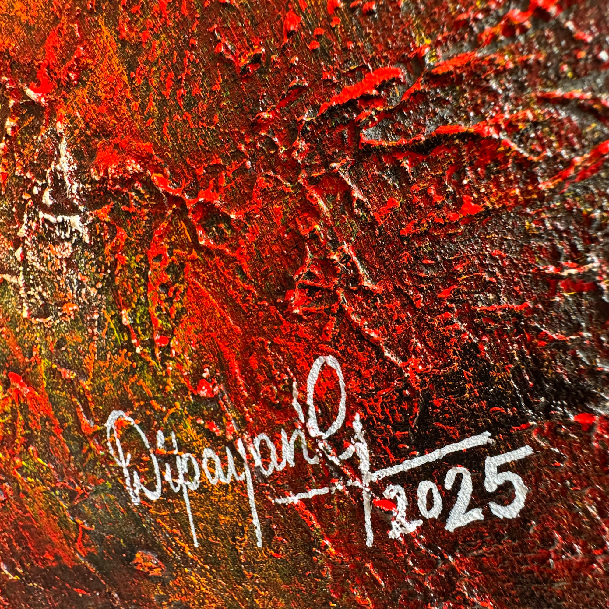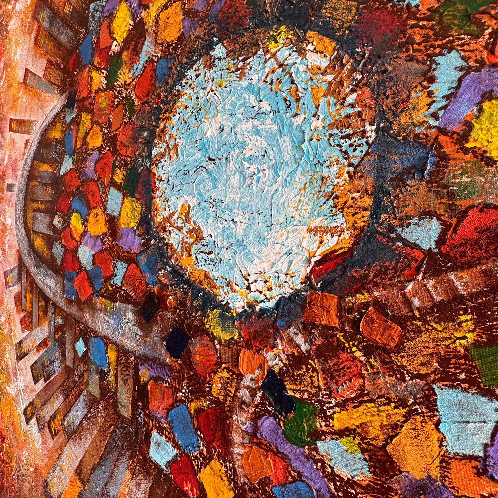 In this monumental textured work, Dipayan Ghosh reimagines Mumbai as a living mandala — an intricate organism of endurance, motion, and light. The concentric circles represent the layered anatomy of the city. The calm blue of the Arabian Sea is at its heart, serene yet unceasing. Around it spiral the dense, colourful mosaics of modest dwellings — reds, yellows, and ochres symbolising countless dreams. Beyond them rise skyscrapers, towers of ambition and privilege, their rhythm cutting upward like prayers to progress. Distinct worlds orbiting one another in uneasy harmony.