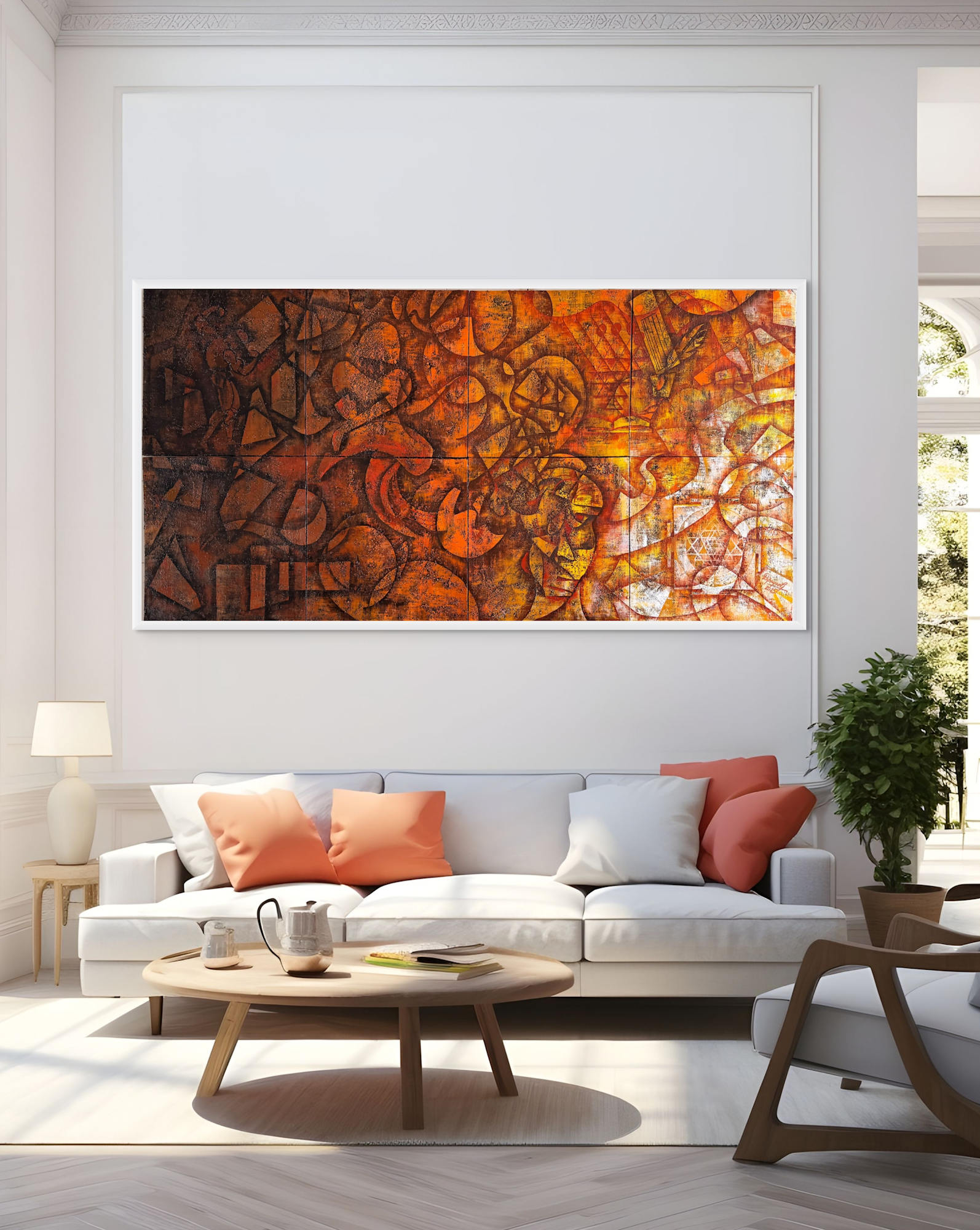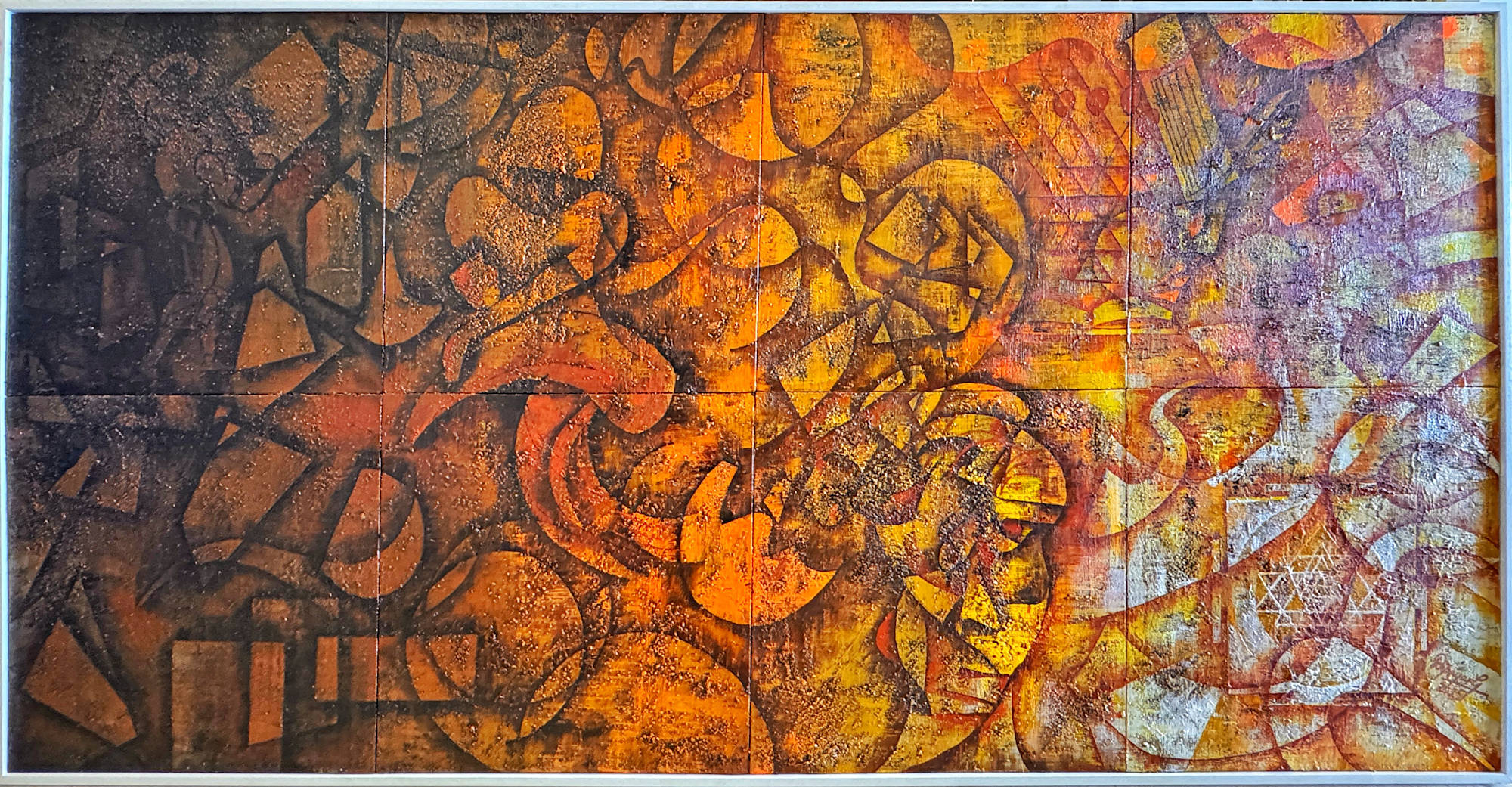 This artwork moves from dark to light, from left to right, as the conversational journey with one’s own self is undertaken. Sharp lines and rough structures gradually smoothen to waves and moving lines, merges into a human mind with conflicting thoughts and emotions. But leads to knowledge and finally arrives at the eternal enlightenment through Sri Yantra.