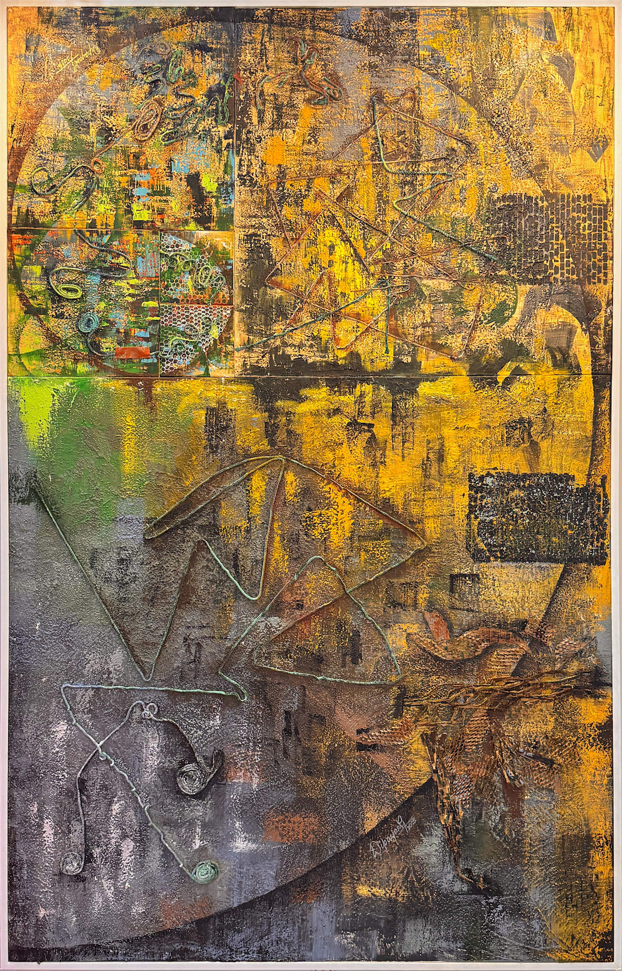 Parakriti is an infinite dialogue between Nature and Industrial Revolutions (explained through exponential Fibonacci series canvas sizes). The artwork currently has been made out of 5 canvases. The canvases are of sizes 6 sq inch, 6 sq inch, 12 sq inch, 18 sq inch, 24 sq inch and 48 sq inch. They are placed in Fibonacci series exponentially increasing in size as per the Golden Ratio of 1,1,2,3,5,8. This artwork also can infinitely continue by adding canvasses in the same Golden ratio spiral. The next canvas sizes would be 72 sq inch, denoting 13 (the next number of the infinite series). Thus depicts never-ending dialogues towards equilibrium between Nature and Industrial progress. The fibre threads pasted on the canvas exemplifies the never-ending dialogue between nature and industrial progress. How Industrial Progress wanes away nature exponentially, while Nature fosters never ending negotiations through climate and conservation initiatives to hold itself together.