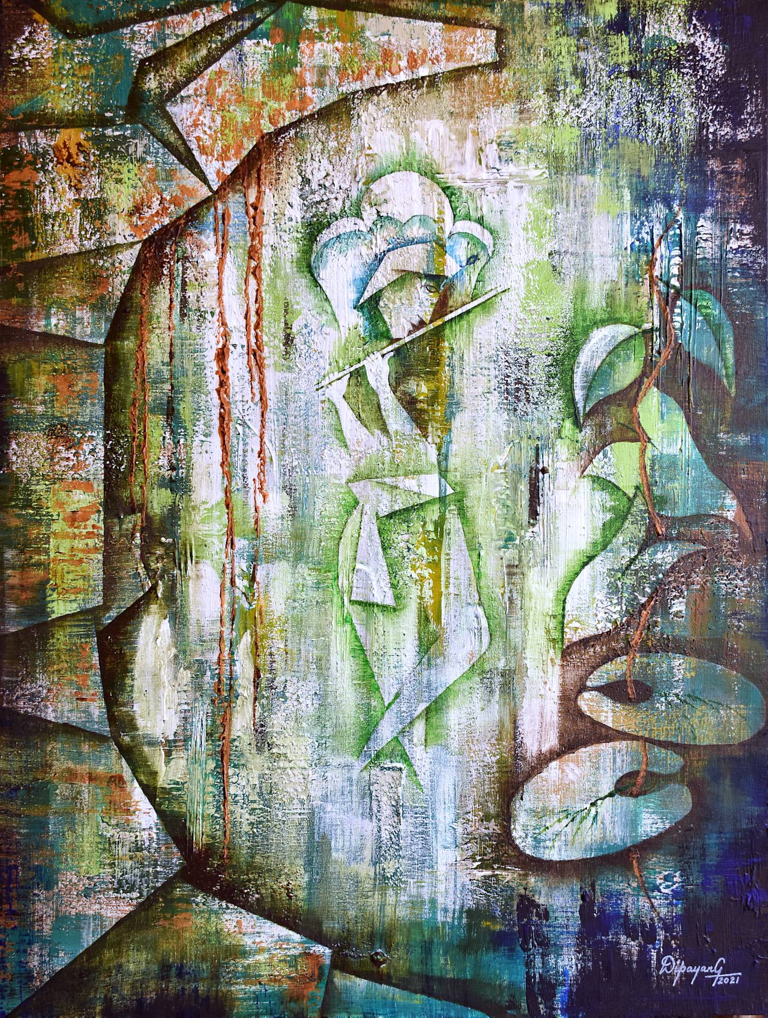 “Gunatray”, as a series, bases on Yogic Philosophy. It depicts the three “gunas”, viz. Sattva (purity, harmony), Rajas (activity, opulence, rule), and Tamas (negativity, darkness, destruction). “Sattva”, with shades of purity and freshness, depicts nature and symbolizes Lord Vishnu (Krishna).