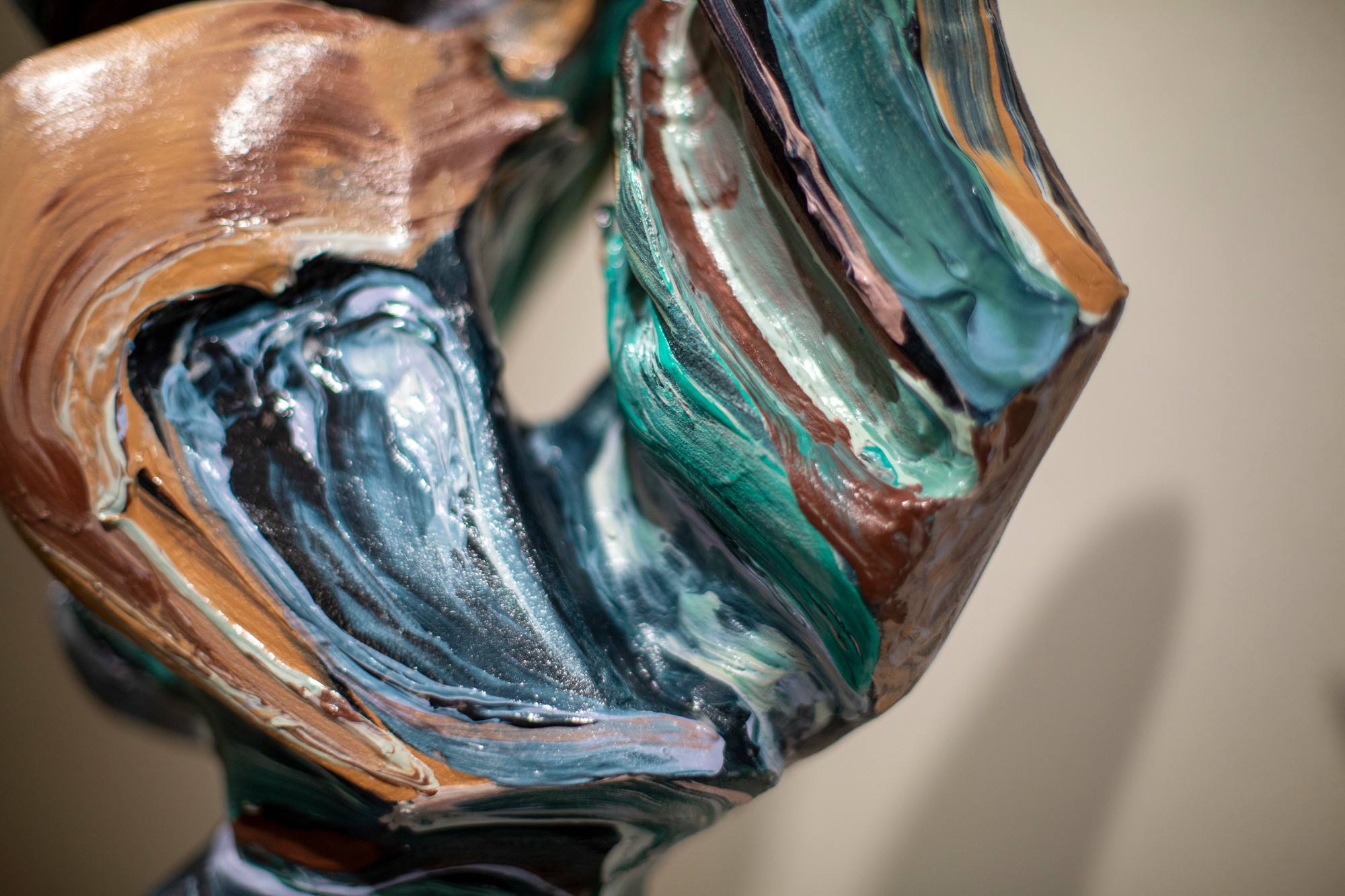 Even though my work has mostly been in two-dimensional form of painting on canvas, the forms and movements created have always wanted to exist in a three-dimensional space. After experimenting with various materials, I needed something light to portray the weightlessness that the paintings have from the brush-strokes. I settled on a very dense type of styrofoam that I was able to shape easily while not being too heavy. Mostly using wood-carving power tools, the shapes are formed similarly to the process in which the paintings are formed.