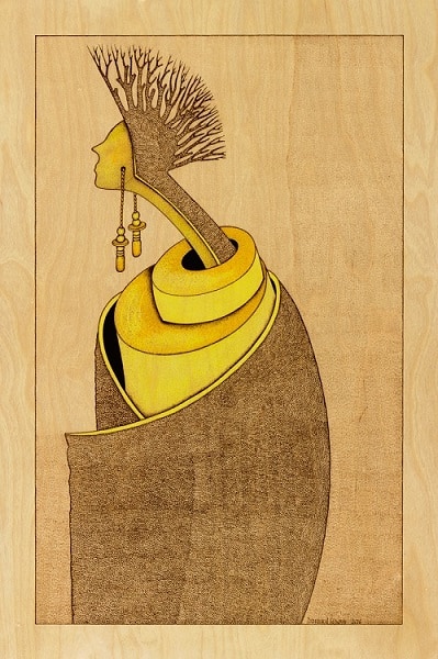 34 x 22”, Original Woodburning with color pencil on Birch Panel