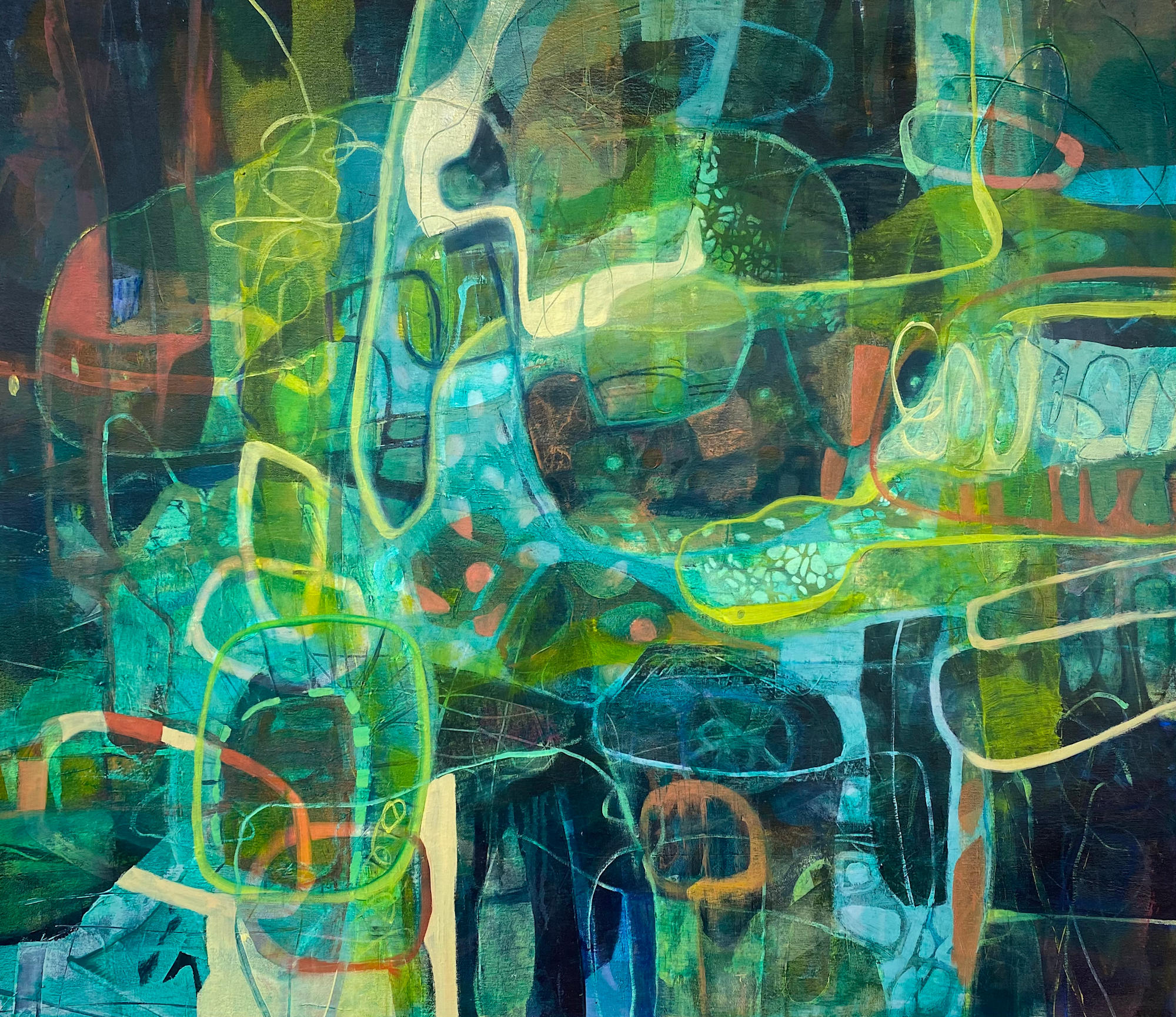 “This painting speaks of intuition—the quiet, daring voice that knows. It evokes the subtle signs that rise from the depths: a sound, a sensation, a fleeting feeling that pierces the veil of the unconscious. Like whispers breaking through the dark, they slip gently into awareness. An invitation to pause, to look closer, and to breathe fully into the moment.”