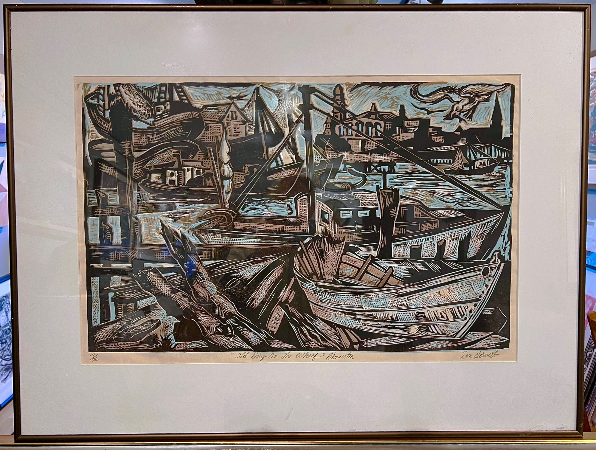 An early reduction woodcut of Gloucester, MA. The woodcut was made while living at Stillington Hall in Gloucester, MA.