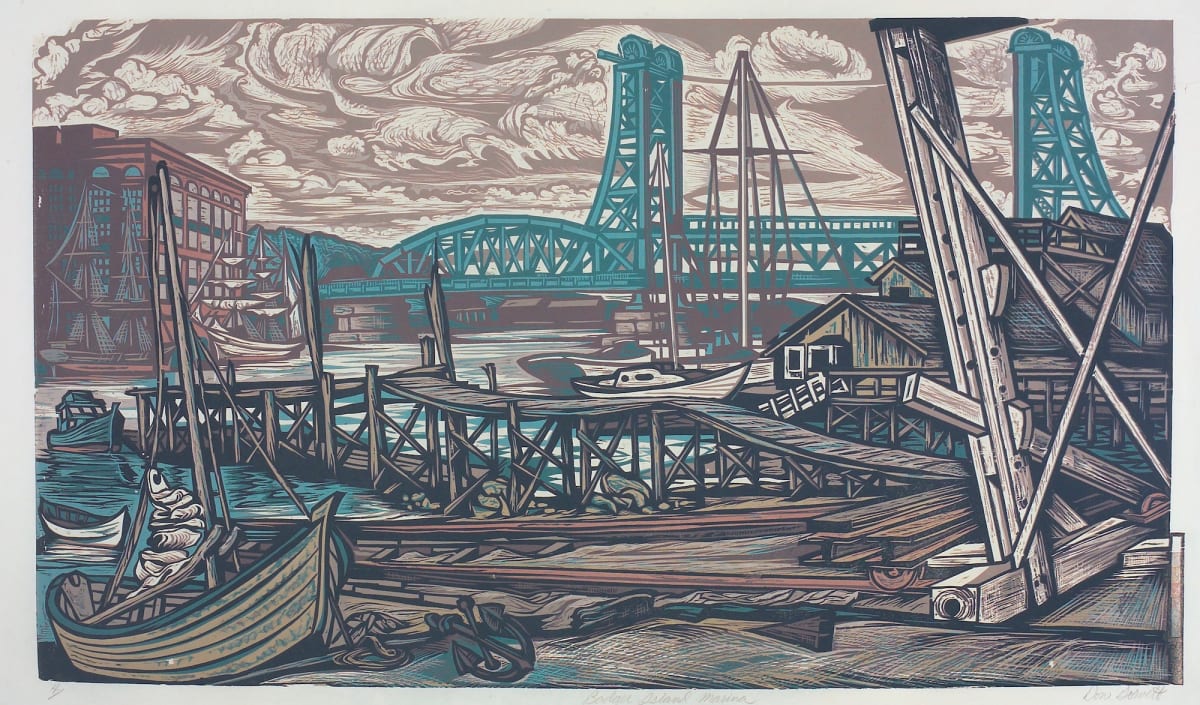 A view of the original Memorial Bridge and Harbour Place in Portsmouth New Hampshire, as seen from the Badger Island Marina in Kittery, Maine. Don would drive into Portsmouth, New Hampshire, from Ogunquit, Maine, with a friend working on the Pierce Island Bridge. Don would spend the day exploring and drawing from both sides of the Piscataqua River.