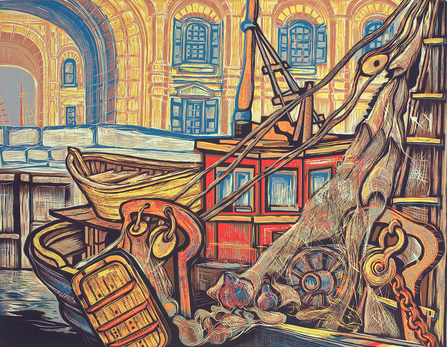 State Pier Revisited is a reduction woodcut based on an early tempera painting that is part of a series celebrating various aspects of the working Boston waterfront, created in 1967. As the title suggests, it serves as an artistic review in the form of a complex woodcut produced 33 years after the preliminary study.