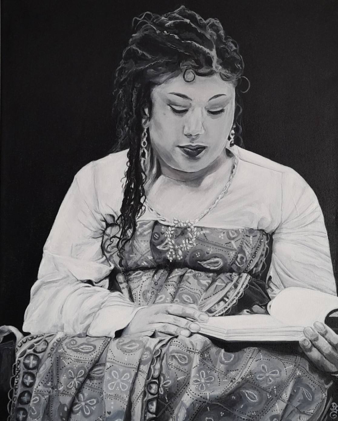 This portrait of a young woman reading a book brings to mind that serene calm that overtakes you while engaged in a good book.