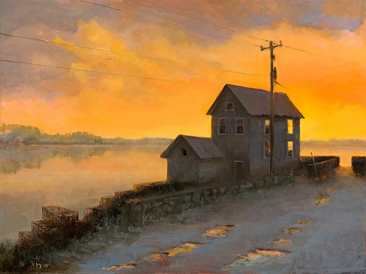 This painting began in Oyster, VA. Seeing the sunrise through the windows one morning was absolutely incredible. I usually lean toward a neutral palette, but I cut loose on the color just to get close to the beauty of this sunrise.