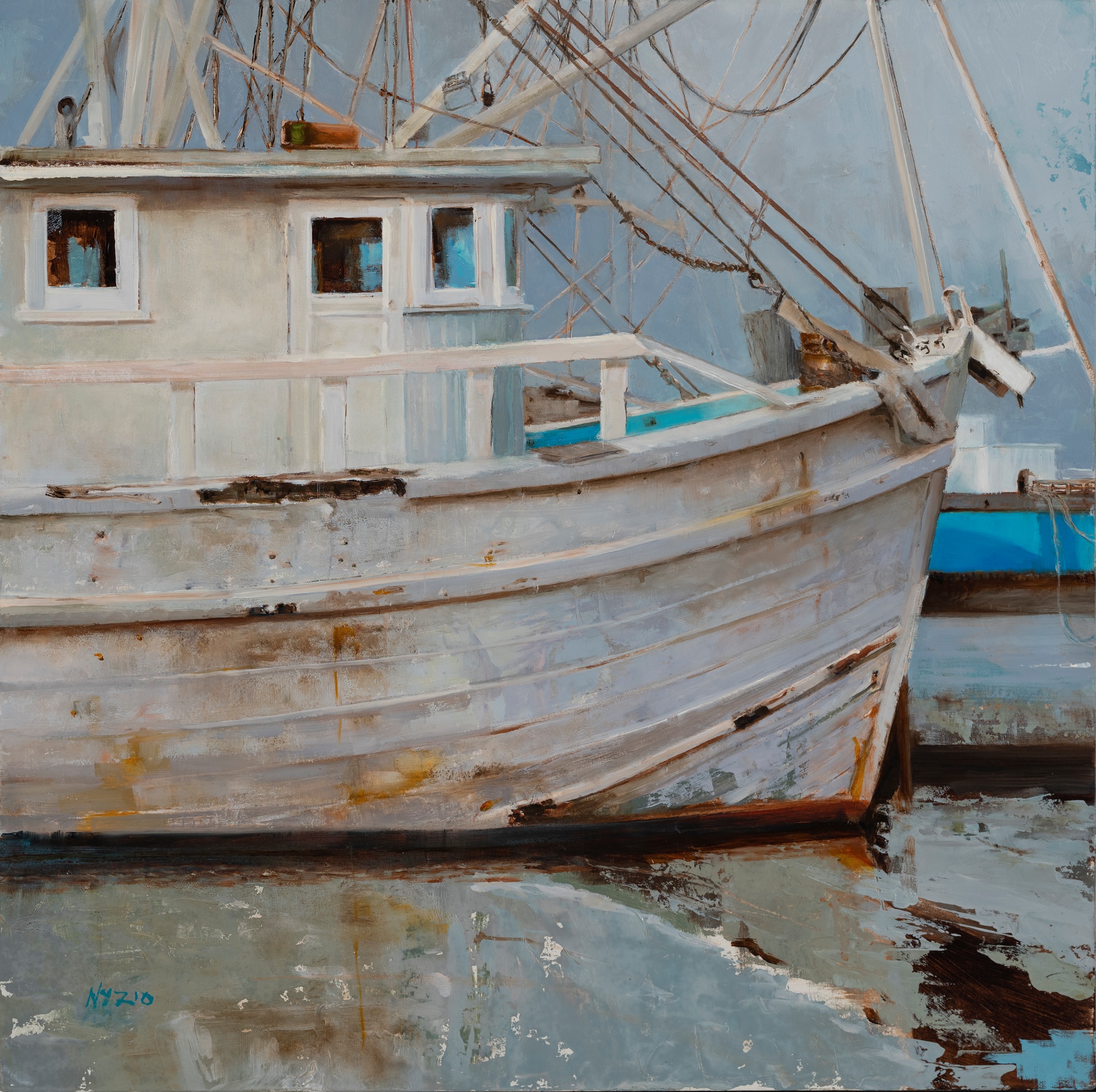 Miss Josie is working girl perfection. With her rounded wheelhouse, peeling paint, and sultry sway in the water, she carries a “been there-done that” attitude only attained through years of hard work. Surrounded by a symphony of blues, and a worried sky, she waits for her next run on the water.