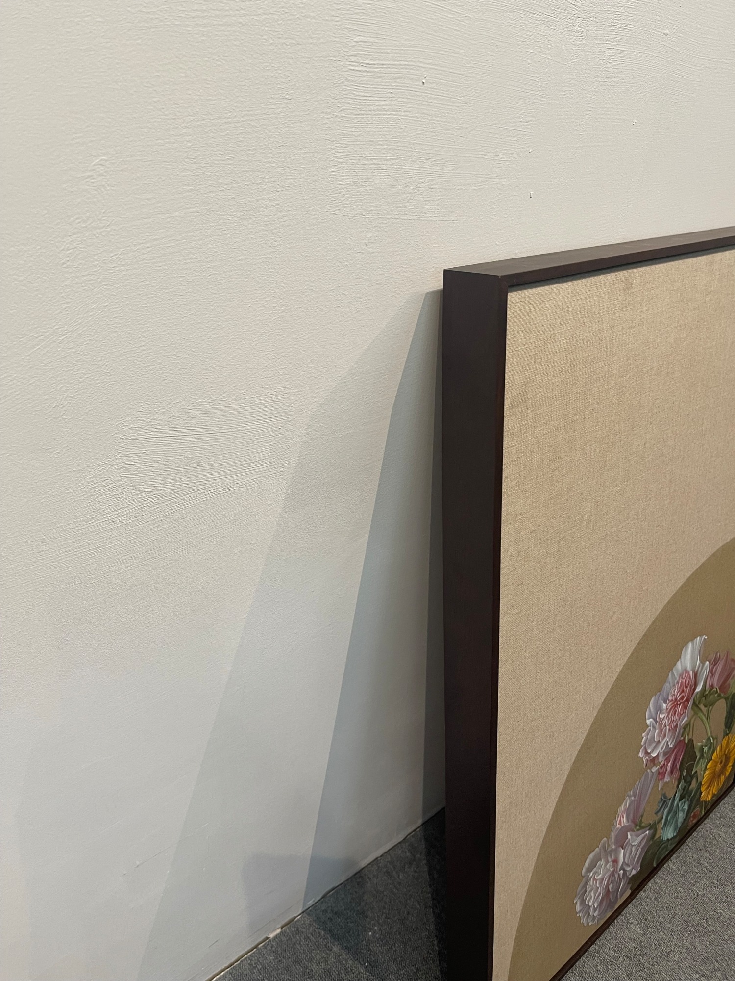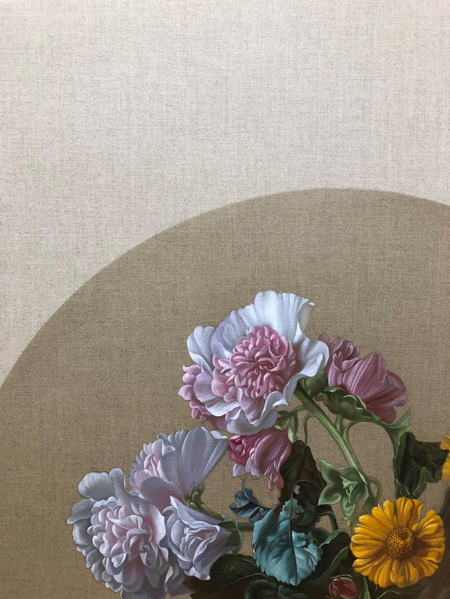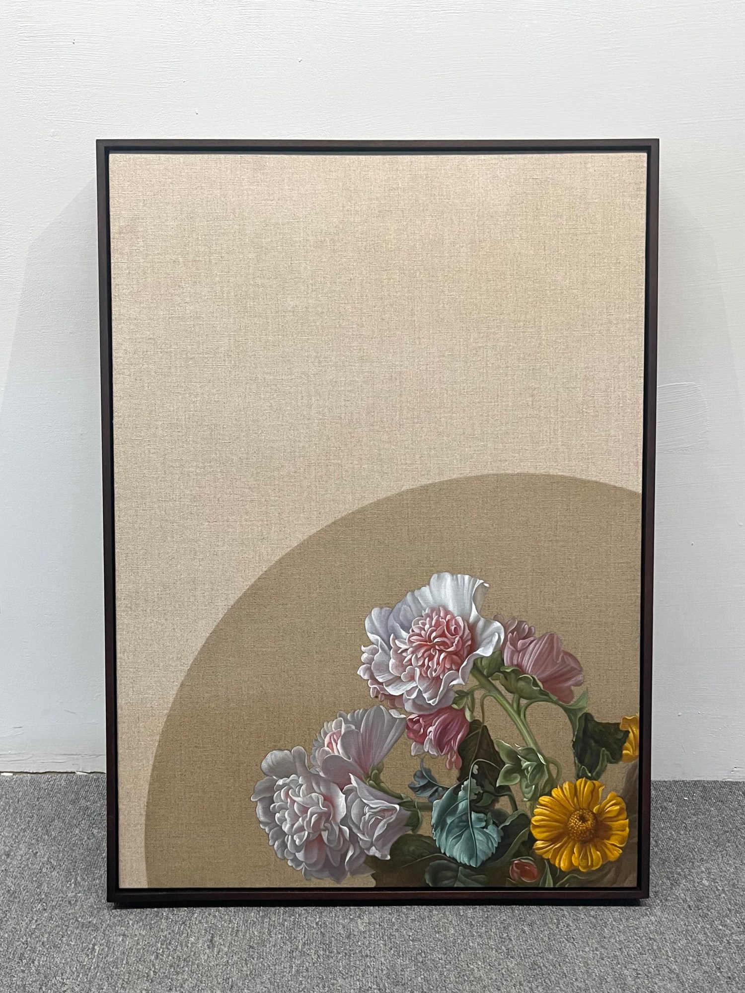 Message盧昉自國立台灣藝術大學美術系畢業後,即到西班牙薩拉曼卡大學攻讀美術系研究所,紮實的寫實功力頗受好評。「東方與西方」以及「古典與當代」一直是盧昉創作上的靈感泉源。盧昉長年生活於西方,基於對於文藝復興時期繪畫的喜愛,回台後生起把古畫及當代生活融入一起的想法。此圖盧昉將郎世寧的美學做為研究對象。特別從未打底的麻胚布開始,從題材、構圖、型制上嘗試再現當時繪畫的特性。藉由西方的繪畫用具,呈現出東方繪畫中的細緻質地,打破了「材料本身的美學體系」侷限。