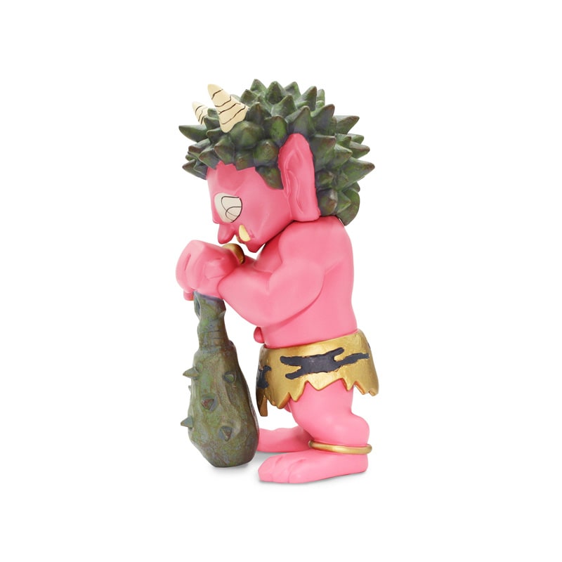 瀧下和之が描く「桃太郎図」に登場するユニークな鬼のフィギュア。表情豊かな鬼たちが、金棒を手に仁王立ちし、にらみを利かせています。