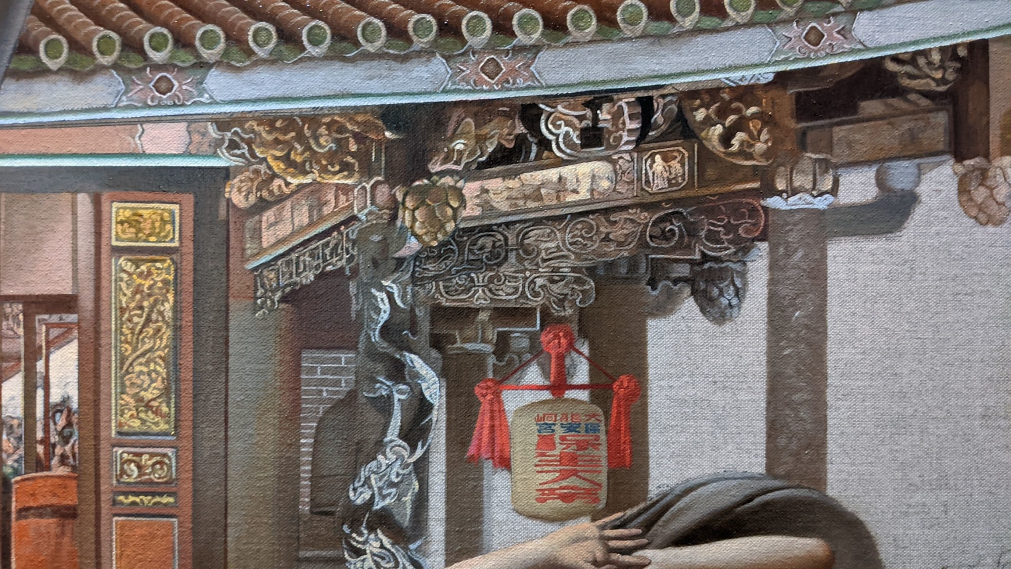 藝術家宛如一齣舞台劇的導演,以空白的麻布作底,使背景以扁平效果呈現,降低廟宇背景的透視感,前排的演員以戲劇性的姿態登場,拉開序幕。