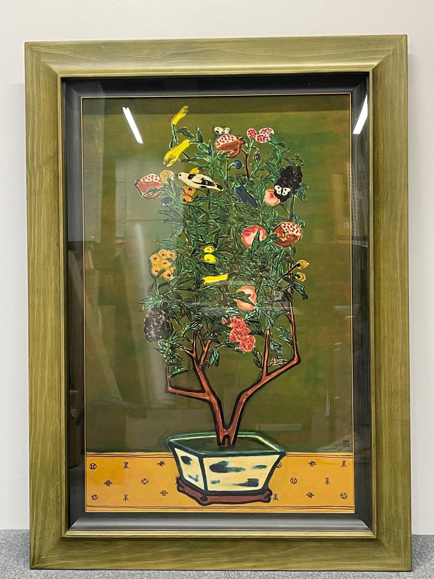 Message此畫作於1950~1960年代,綠葉繁花交錯,果實叢生,鳥雀飛蝶嬉鬧於花葉間,蓬勃生命力躍然畫面,與常玉1930-1940年代乾淨整潔的購圖大異其趣。承載盆器的桌面上滿布古老中國符號,見證常玉於西方油彩之餘,不忘向滋養自己的故土文化致敬。