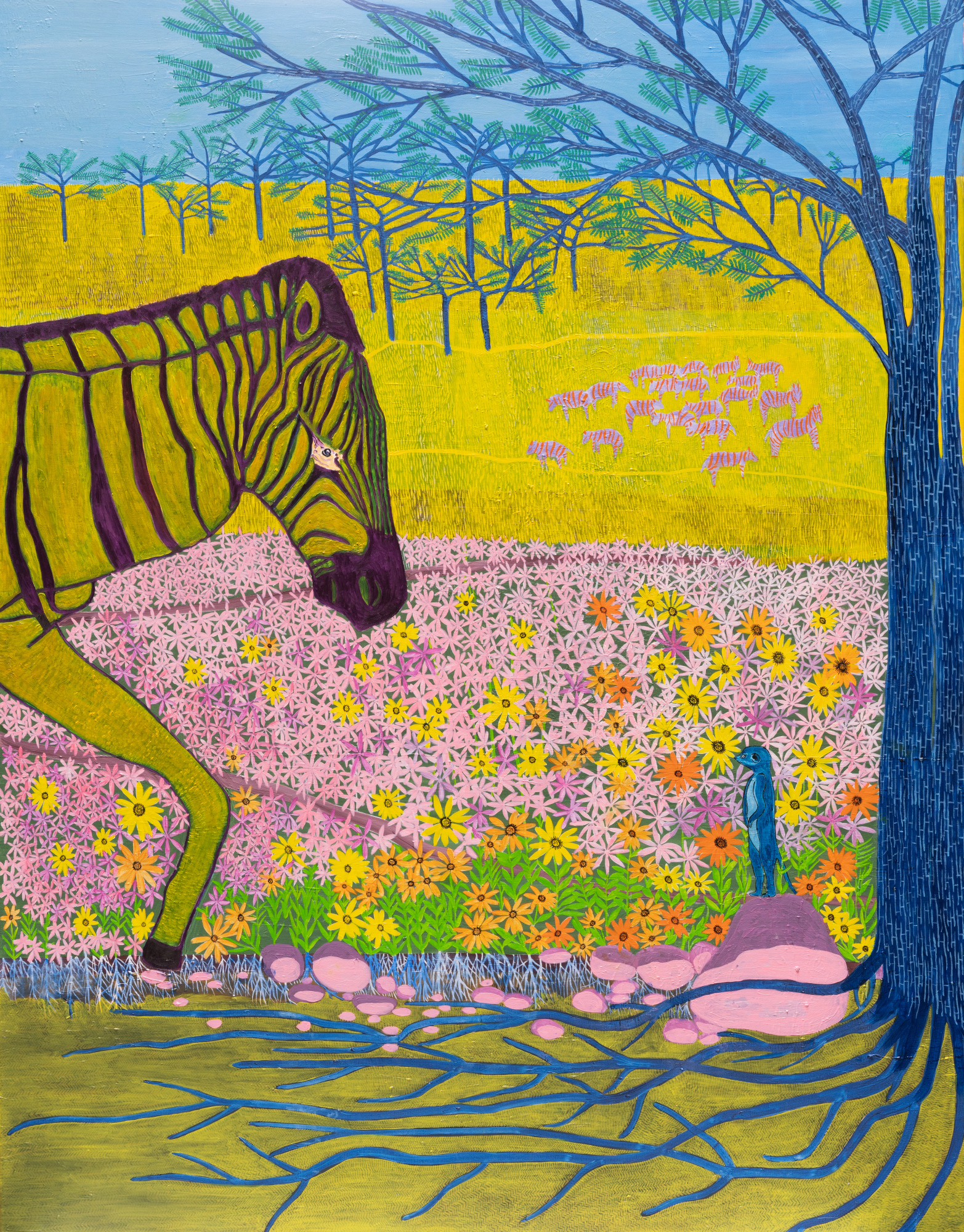 Set against the pristine natural backdrop of South Africa, a zebra and a meerkat in the painting engage in a dialogue that transcends spoken words, speaking silently through their eyes. The vibrant hues of oil paint, interweaving yellow, blue, green, and a sea of pink flowers, compose a hymn to nature, symbolizing admiration and respect for the natural world.