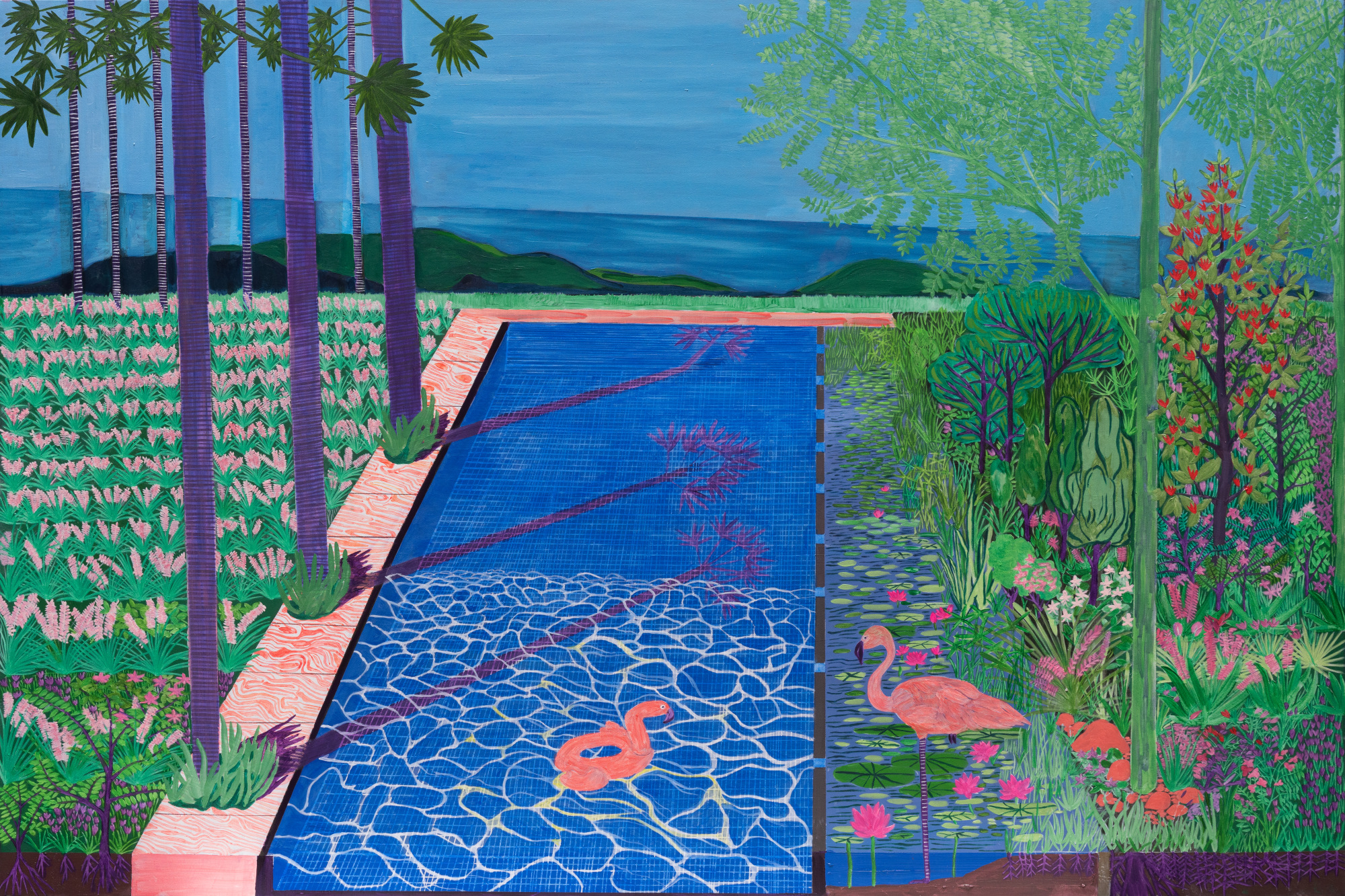 Message《花園對話 No 4》展現了洛杉磯的景象,畫中呈現了一個豪華的花園,擁有海景和游泳池。主人養了一隻真正的火烈鳥作為寵物,它凝視著游泳池中的塑料火烈鳥游泳圈。游泳池的水面反射著微光,暗示著有人剛剛離開或風吹拂的痕跡。花園中種植了典型的洛杉磯植物,如扇形棕櫚樹,一側有層層盛開的花卉,而另一側則採用更現代的種植風格,一排排的草本植物。