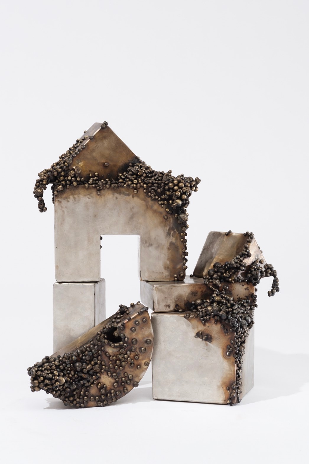 以積木的形象,代表從孩童的角度中所看出的家,寄生的鋼珠是這個家庭的變質,隨著時間,在這