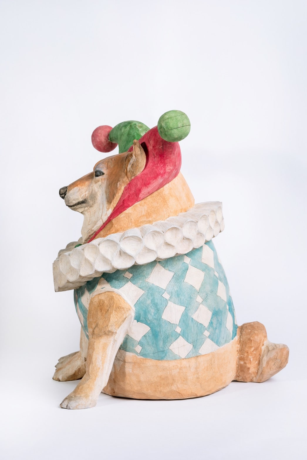我以木質雕刻為這隻成為迷因的柴犬穿上小丑裝扮,下了一個《小丑竟是我自