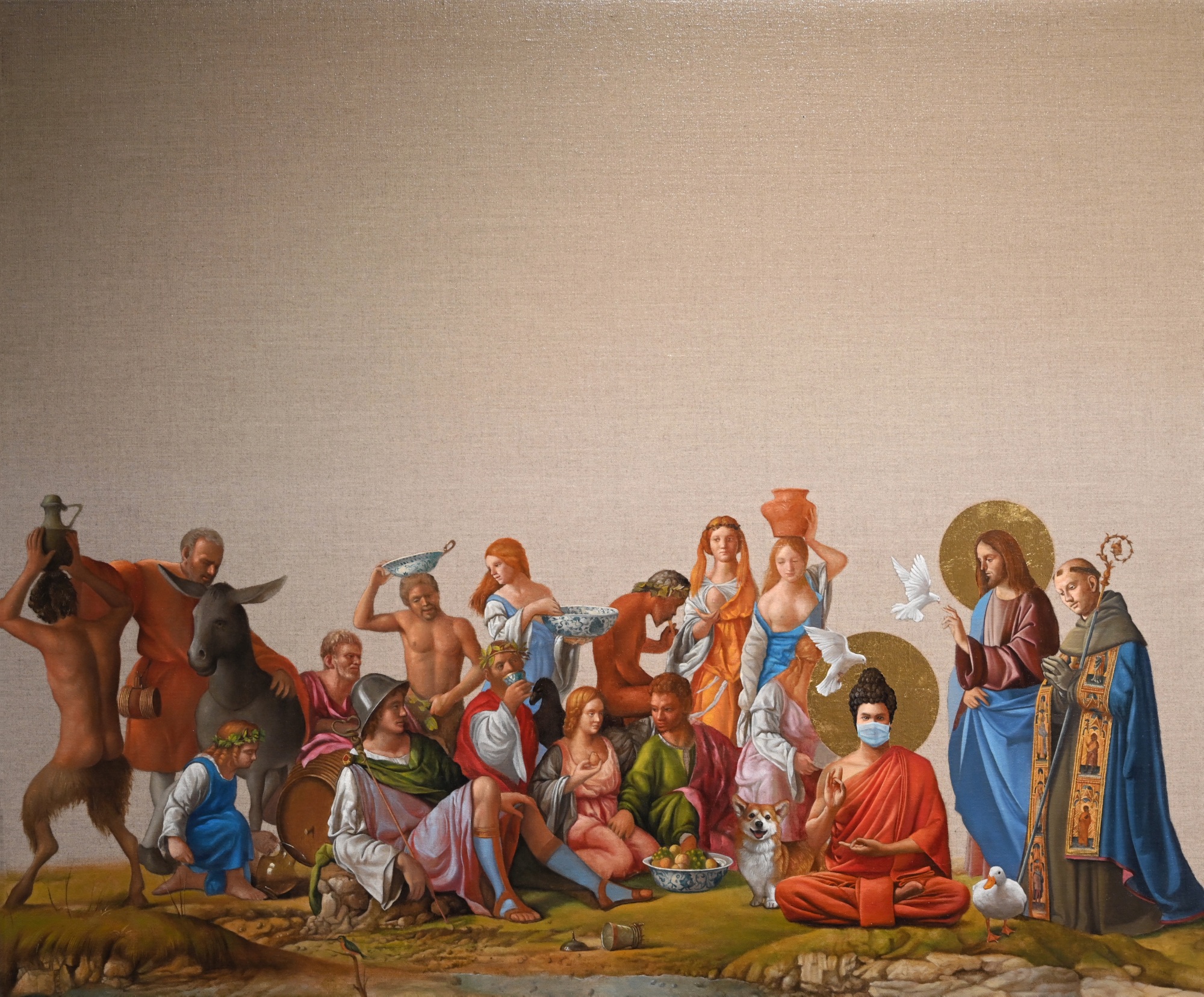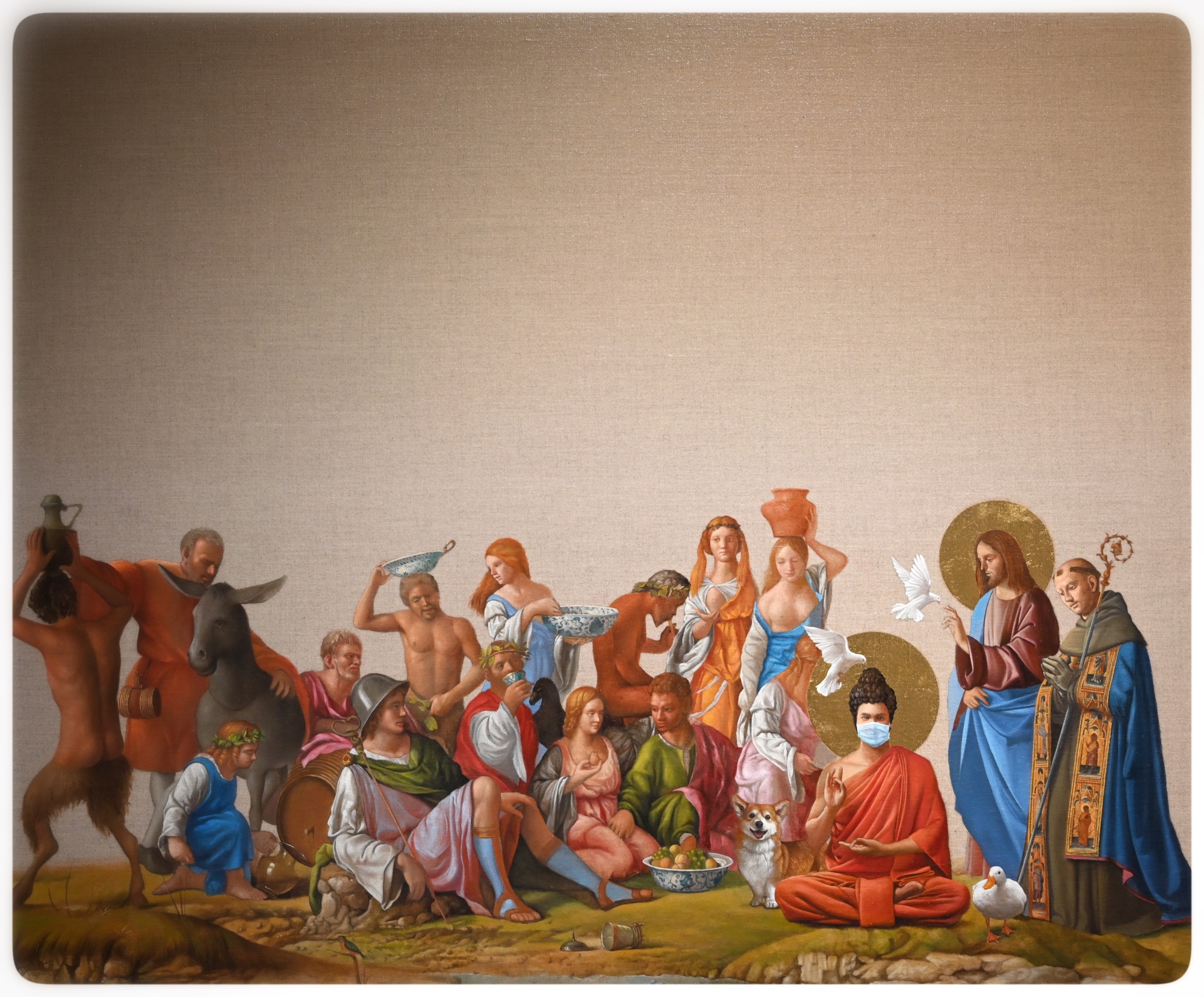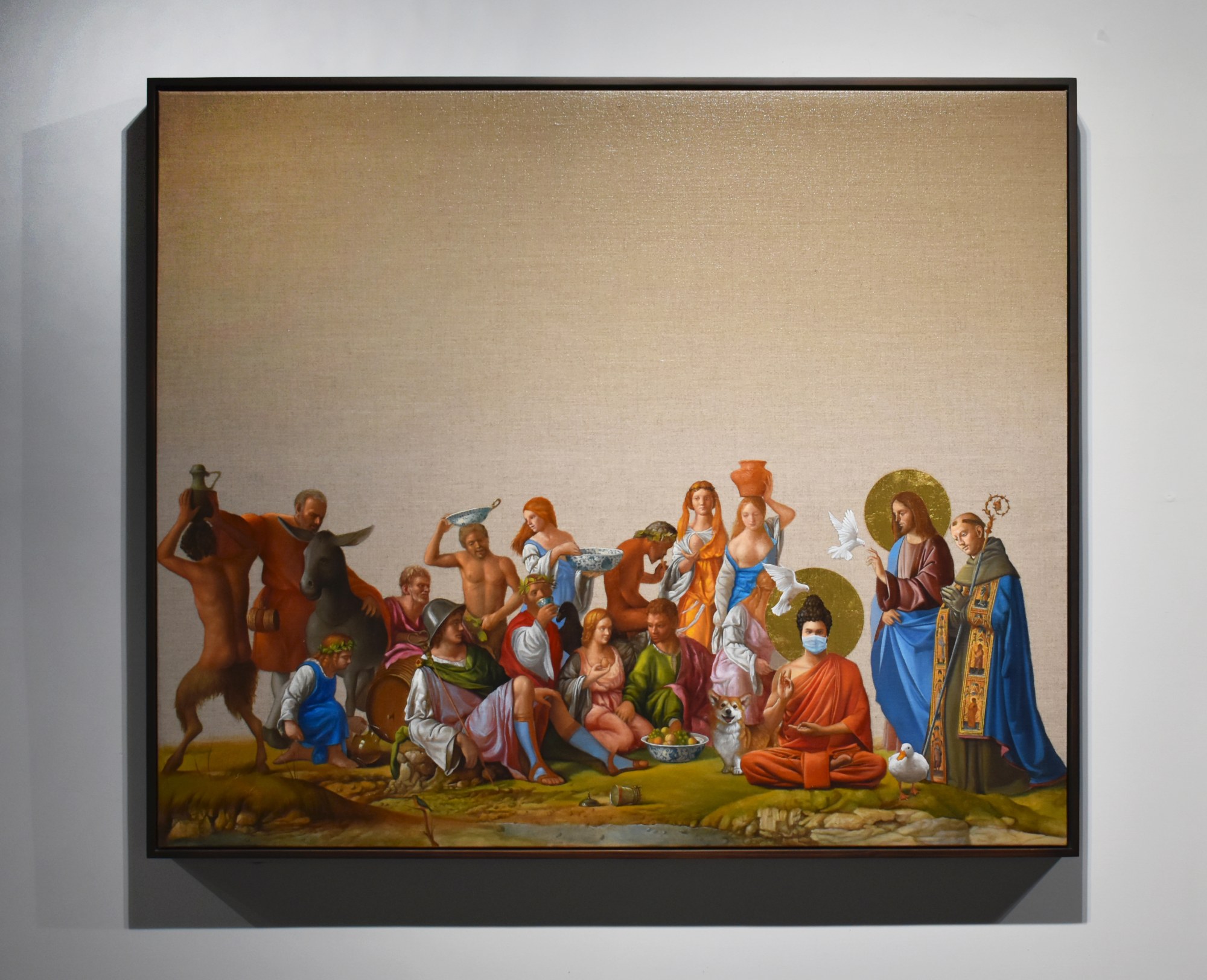 Message《諸神的盛宴》是貝里尼一生所畫的最後一幅傑作,這幅色彩豐盛的畫取材於奧維德﹝Ovid﹞的《盛宴》﹝Fasti﹞中的詩句,描述在一次酒神的盛宴中,生殖神普里阿普斯薩﹝Priapus﹞因為行為不檢,在宴會中出糗的事情。從這幅畫中所展現的肉體色調、燦爛光輝的絲綢,以及前景的小卵石,都證明貝里尼的繪畫技巧非常靈敏。畫面最右邊斜躺了一位仙女洛提絲﹝Lotis﹞,最左邊是一位長得像半人半獸的神,祂們陪伴諸神在聖宴中把一頭驢子供為牲品。生殖神禁不起肉慾的誘惑想把仙女洛提絲的裙子掀起來,但是驢子的叫聲使他的企圖歸於失敗而當眾出糗,在座諸神因這件糗事莫不歡天喜地。這段插曲充份表達了優雅而俏皮的文藝復興期之宮廷風俗。