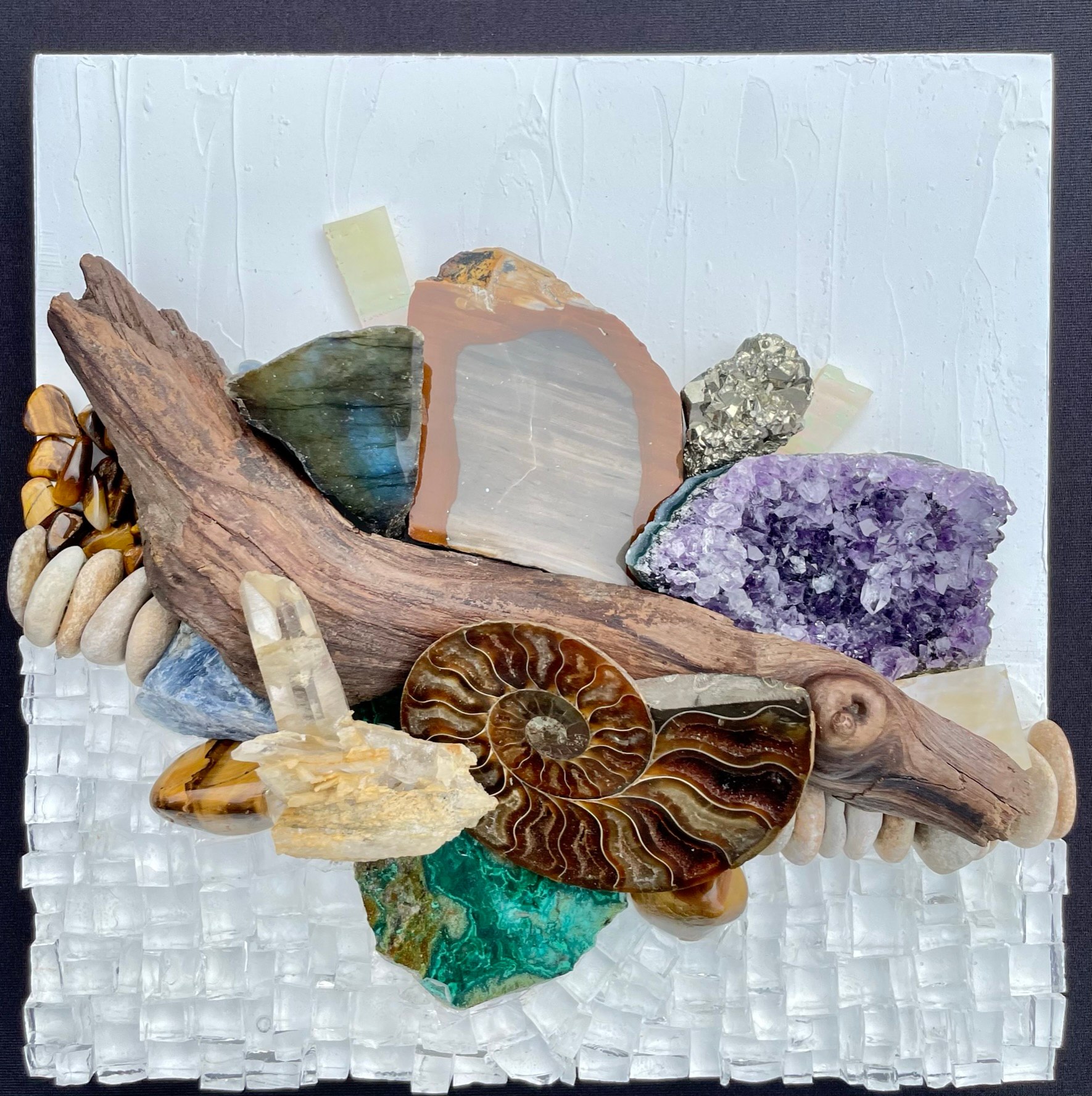 Hand cut art glass, driftwood, agate from Czech Republic (the empty tomb), ammonite, labradorite, amethyst, tiger eye, blue kyanite, occluded quartz, moss agate, pyrite