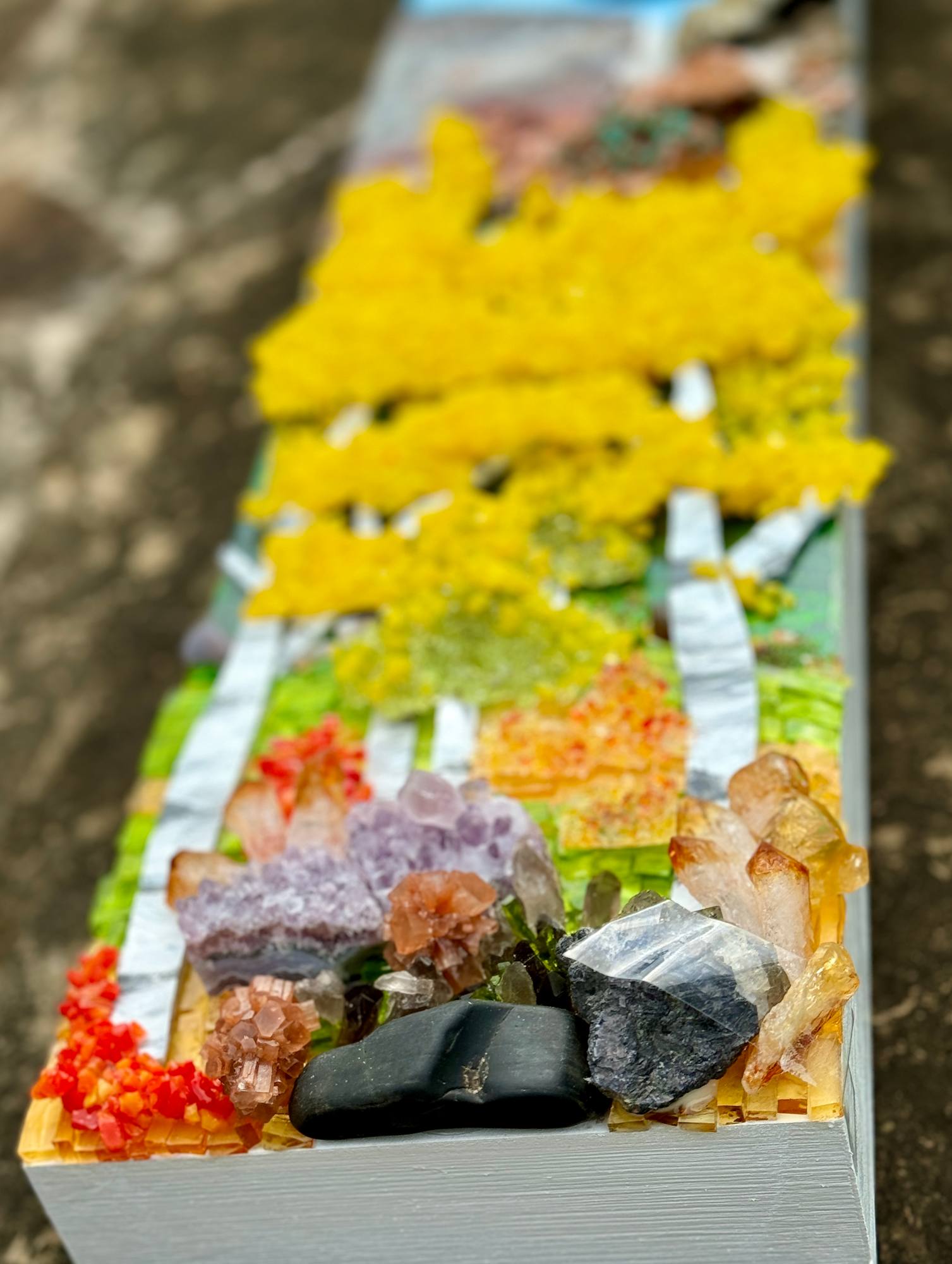 Hand cut art glass, crushed glass, acrylic paint, pyrite sun, fluorite, agate mountain, slate, pebbles, stone, green rhyolite, selenite, vanadinite, epidote, peridot, amethyst, aragonite star, smokey quartz, agate, citrine points