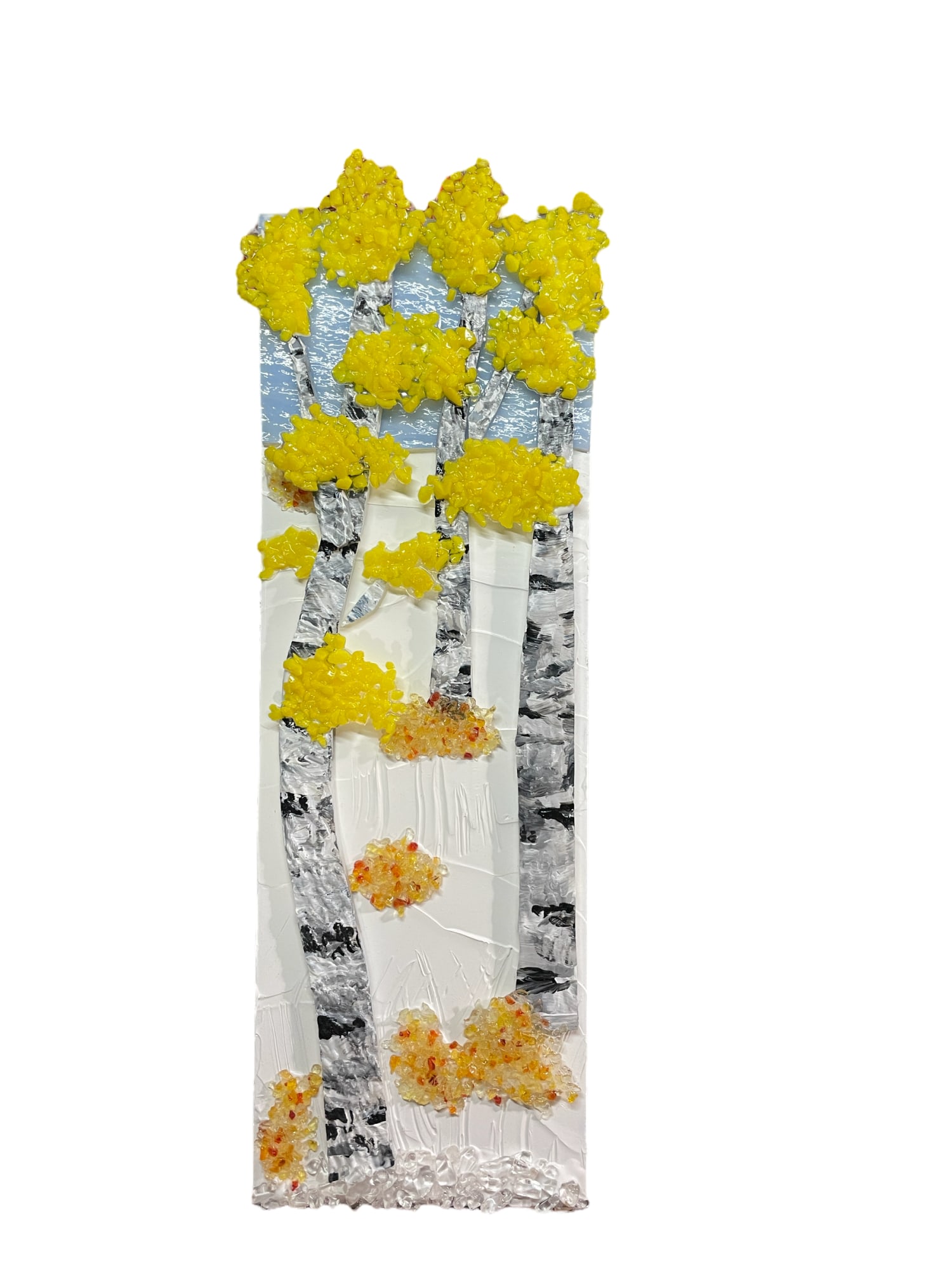 Hand cut art glass, tumbled quartz, acrylic paint.