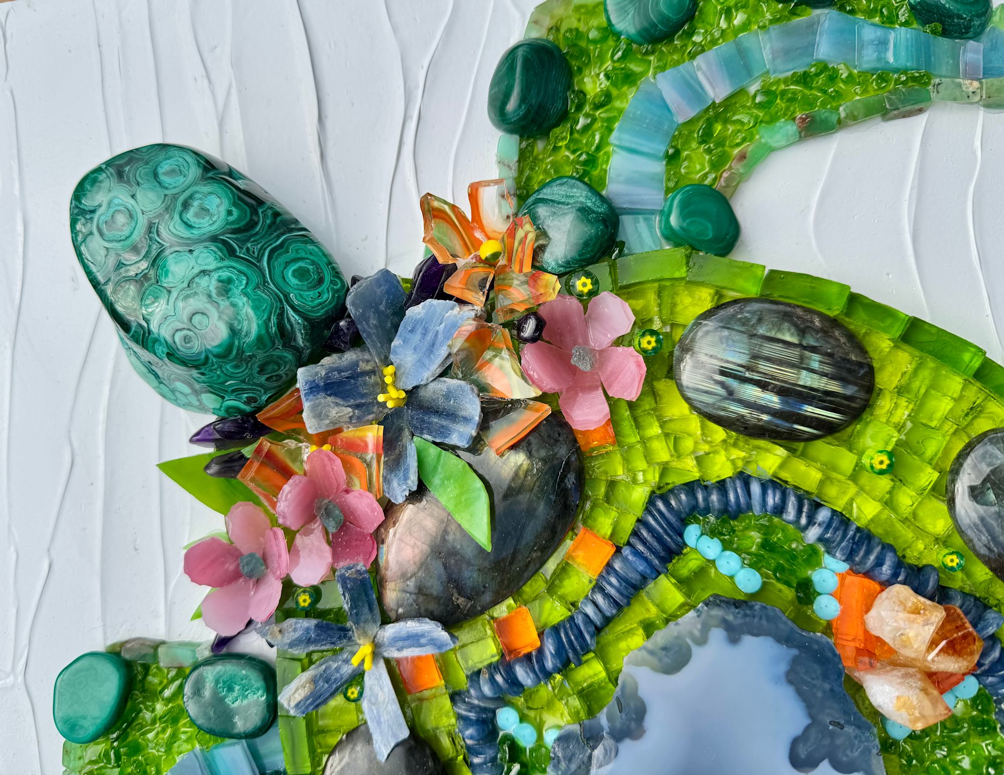 Hand cut art glass, labradorite, malachite, citrine points, amethyst, blue kyanite, amazonite, aventurine, blue agate