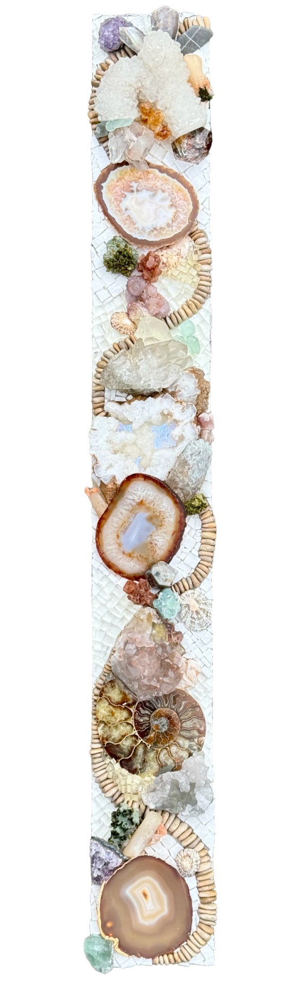 Hand cut art glass and stone smalti, pebbles, quartz stalactite, Lemurian quartz clusters, fluorite clusters, garden quartz, agate, epidote on quartz, vanadinite with barite, aragonite star amethyst cactus, druzy quartz slice, zeolite bow ties, lepidolite with blue albite, flower agate, limpets, collected in Ireland, sliced ammonite fossil.