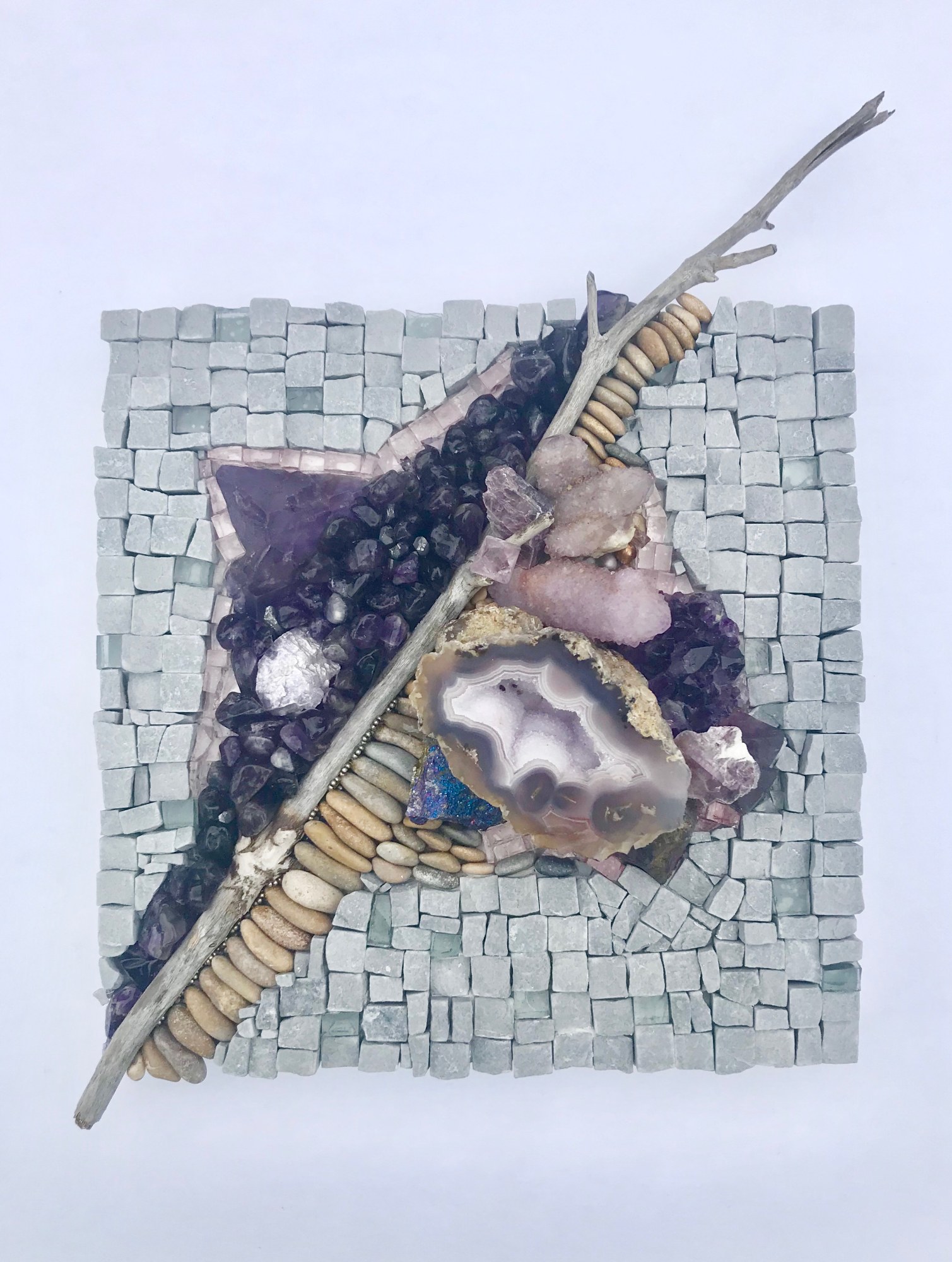Amethyst, Flourite, Amethyst cactus, lepidolite, purpleite, fluorite quad, Purple geode, bonite (peacock copper), gray stone, pebbles, driftwood, glass smalti, sterling silver daisies.