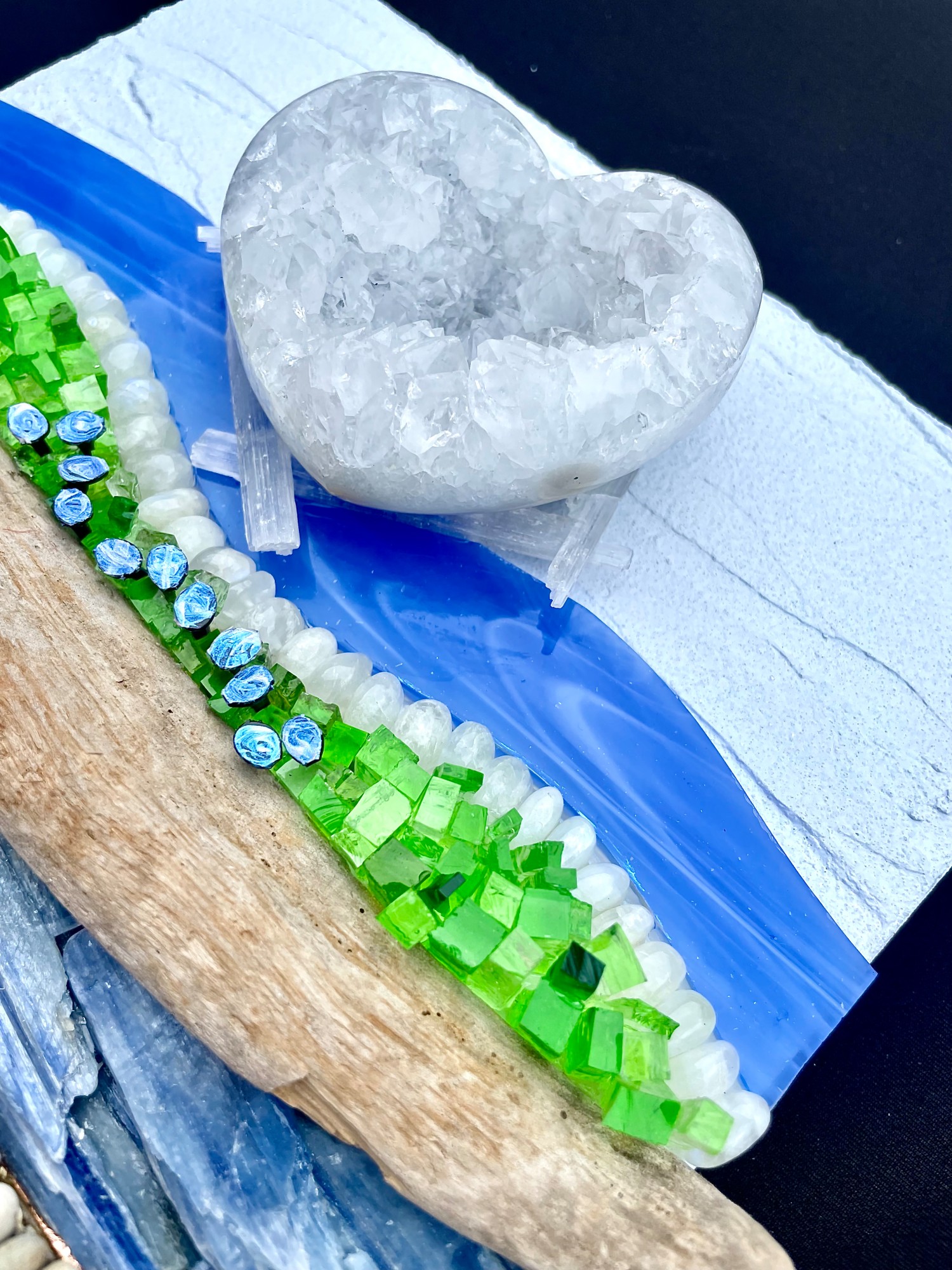 Hand cut art glass, pebbles, quartz crystal heart, peridot, driftwood, moonstone, kyanite, selenite & metal