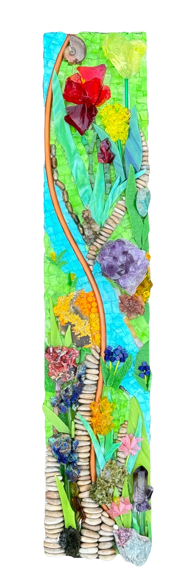 Hand-cut art glass, ammonite fossil, azurite with chrysocolla , amethyst, river pebbles, aragonite star, amazonite, lapis, vanadinite, lepidolite, epidote, bumble bee jasper, rhyolite, aventurine, carnelian, copper, 1950’s slag glass and lamp worked glass.