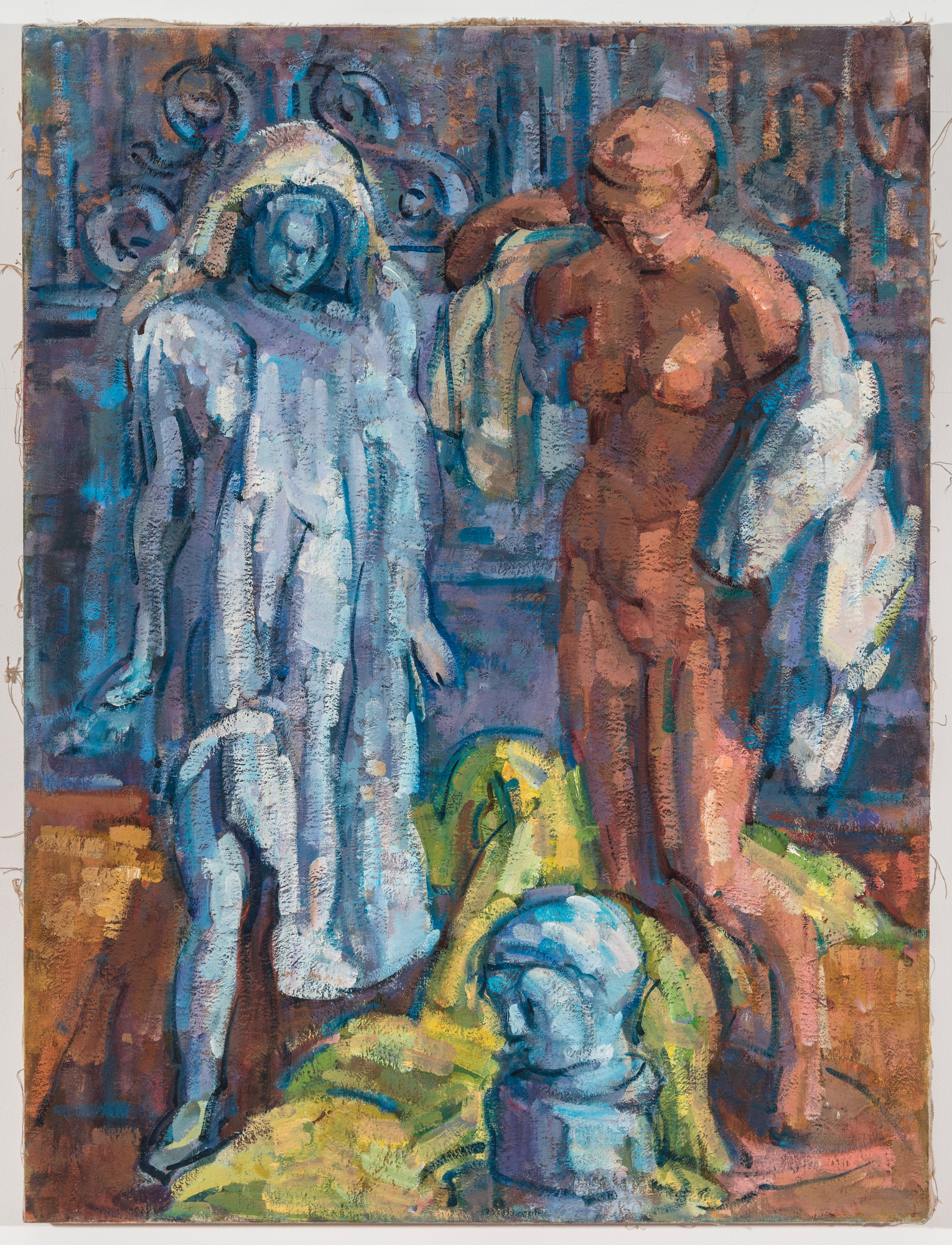 Hieratic yet fluid, light juxtaposed with dark, Beck’s brilliant pairing of the chilly goddess of the hunt with the voluptuous goddess of love is both mysterious and densely detailed. Two small statuettes of Greek goddesses - highly disparate in both character and coloration - loom large, dominating the foreground of this painting, one of the last that the artist finished before her death the following year.