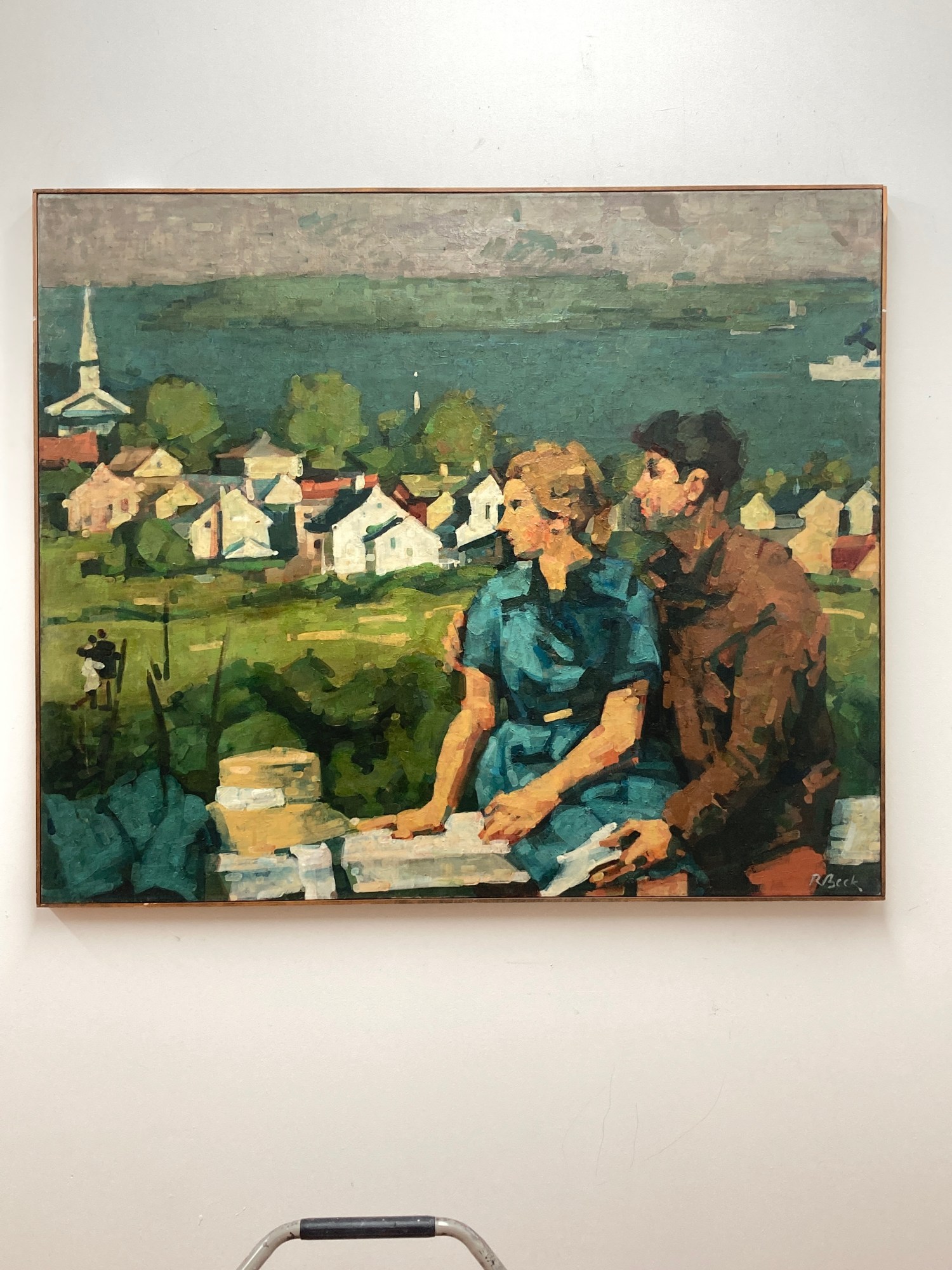 In June of 1966, in residence at the Yaddo artist colony in Saratoga Springs, Beck wrote in her journal that she was “a little afraid” of her new series of paintings, “Lovers.” But this time at Yaddo, as always, saw her securely launched on the new work, resulting in this beautiful “Two at a View.” Unlike in earlier iterations of this theme, Beck deliberately did not include herself “voyeuristically at the easel”, but focused on the unnamed romantically linked duo and the expansive ocean bay view which they survey.