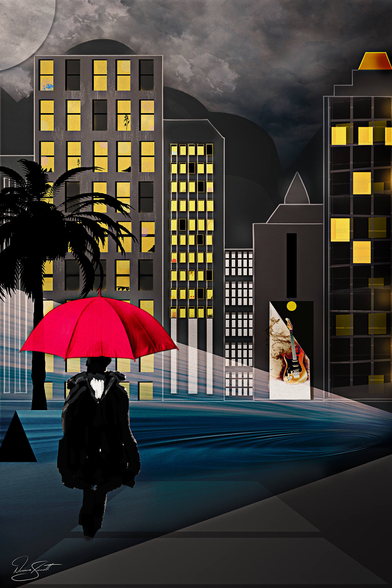 In this piece, I captured a cityscape alive with mystery and enchantment. A lone figure with a red umbrella moves through the twilight haze, surrounded by towering buildings with glowing windows that suggest infinite stories. Using shadows and light, I created a cosmic ballet, blending reality with imagination under swirling, brooding clouds. The eerily calm streets invite exploration into this magical urban realm
