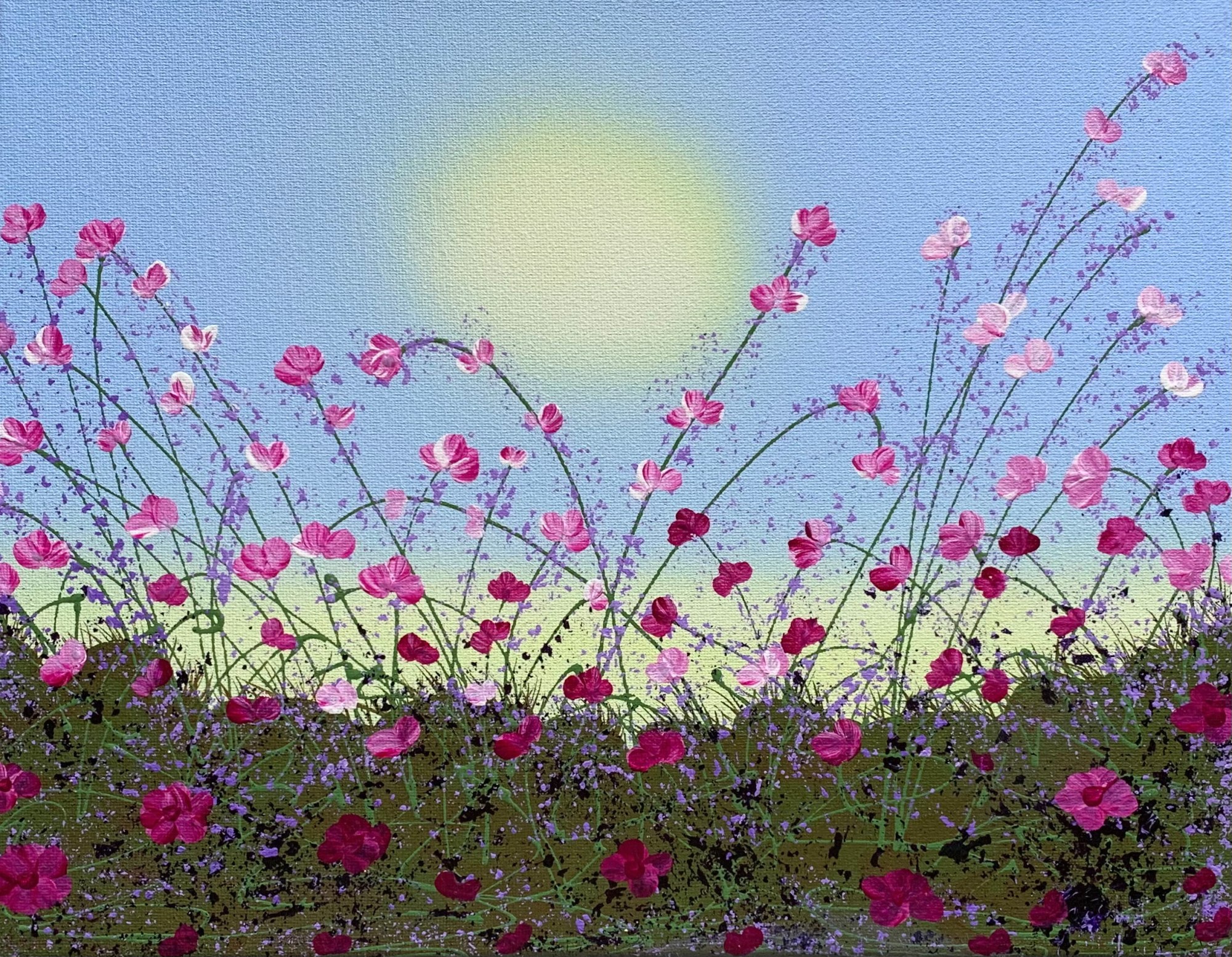 There's a message in this painting. The earth is dark and represents hardship or struggle. The stems are stark but there are just enough blooms on them. The yellow sun and glow behind the land suggests there is happiness and hope coming in the future. I'm often called an artist of HOPE. I paint to create happy emotions in others. This evidence-based (design based on medical studies of human wellness) painting was deliberately and strategically designed to create hope, happiness, and joy.