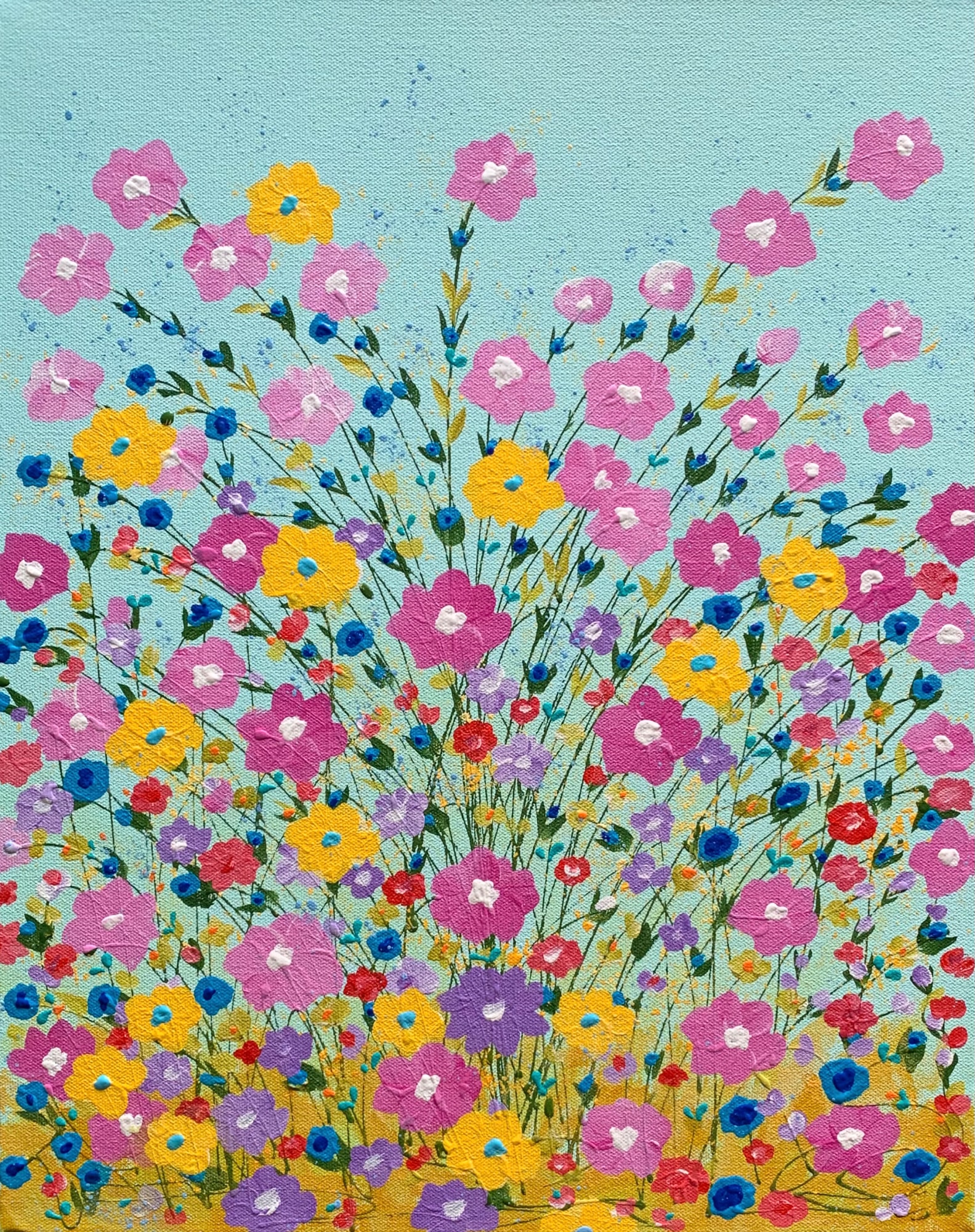 If flowers could speak, this batch would say, "Ta-da!" This is a fun, light, happy painting. It was strategically and deliberately designed to quicken a step, brighten a mood, and create smiles. I am EDAC certified. Many hospital architects, medical facility interior designers, administrators, doctors, nurses, and more have studied for and received this certification. It is design based on actual medical studies for human wellness.